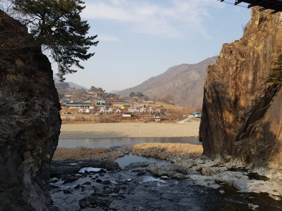 원래는 병풍처럼 산이 늘어서 있었지만 일제가 지맥을 끊고 물길을 돌리기 위해 한 자락을 뜯어 지금의 모습이 되었다. 사라진 능선 위로 구름다리가 놓였다. 그 아래 물길을 '팔봉폭포'라 부르는데, 가까이 가서 보니 수량도 상당하다.