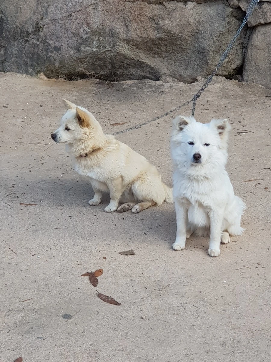 오랜만에 짖지 않는 강아지들을 만났다. 길게 철사를 매어 놓고 그 철사에 목줄을 걸어 행동반경이 꽤 넓다. 다만 줄이 얽혀 본의 아니게 동행이 된 탓인지, 어색한 침묵이 흐른다.