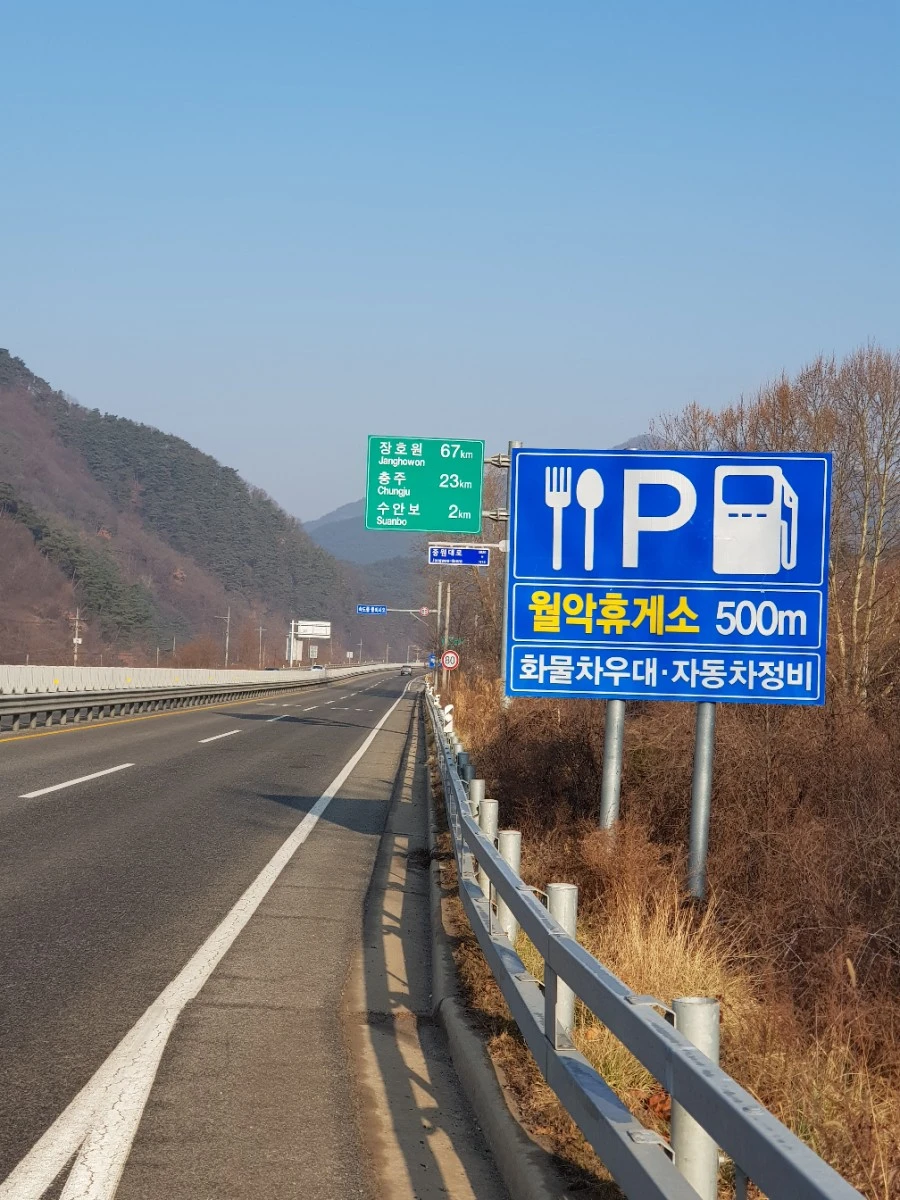 한 시간 가량 이어진 내리막의 끝에서 큰길로 접어들었다. 휴게소 간판이 보인다. 실은 조금씩 배가 아파오던 참이다. 어젯밤 짜게 먹은 라면과 맥주가 탈이 난 것 같다.