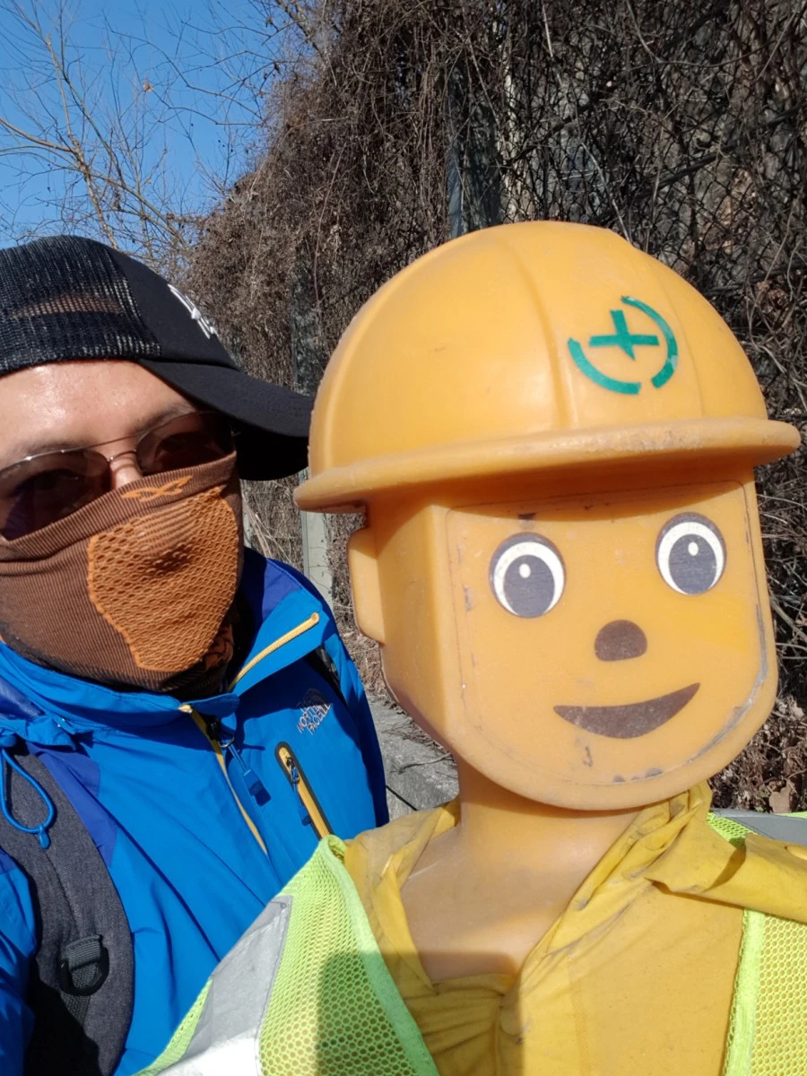 길가에 웃는 낯으로 서 있는 공사안내 인형이 왠지 안쓰러워 잠시 친구가 되어 준다.