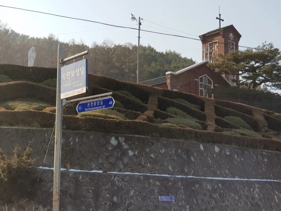 대안보를 지나 언덕을 내려가니 수안보가 나온다. 온천으로 유명한 바로 그곳이다. 마을 입구(반대방향으로 본다면 마을 끝자락)에는 수안보 성당이 자리 잡고 있다.