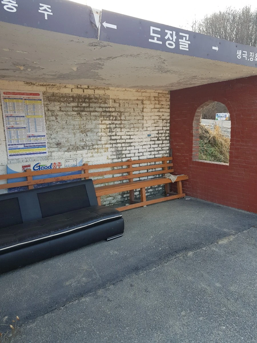 시간은 세 시를 넘겼다. 간단한 요기라도 해야겠다. 마침 버스정류장이 있다. 먼지앉은 소파 대신 나무의자에 앉아 초코바와 사과를 먹었다. 잠시라도 바람을 피하면 좋으련만, 뻥 뚫린 벽으로 찬바람은 야속하게 몰아 닥쳤다.