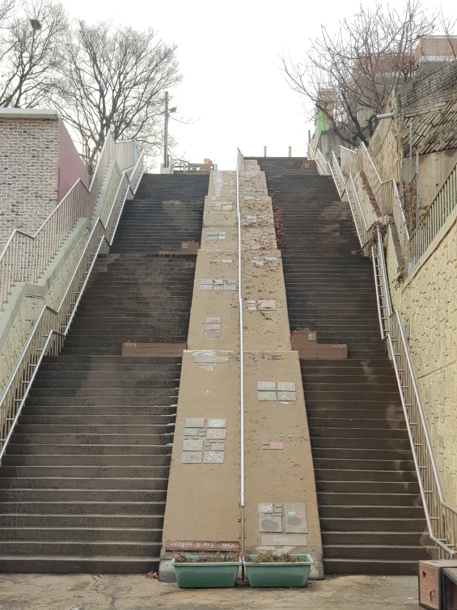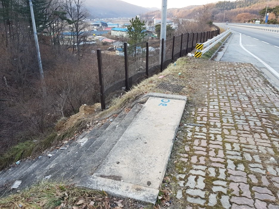 국도에서 마을로 이어지는 계단이 재미있다. 자주 보지 못한 일종의 '국도 개구멍'이다. 복잡한 진출입로 없이 바로 마을로 이어지는 통로다.