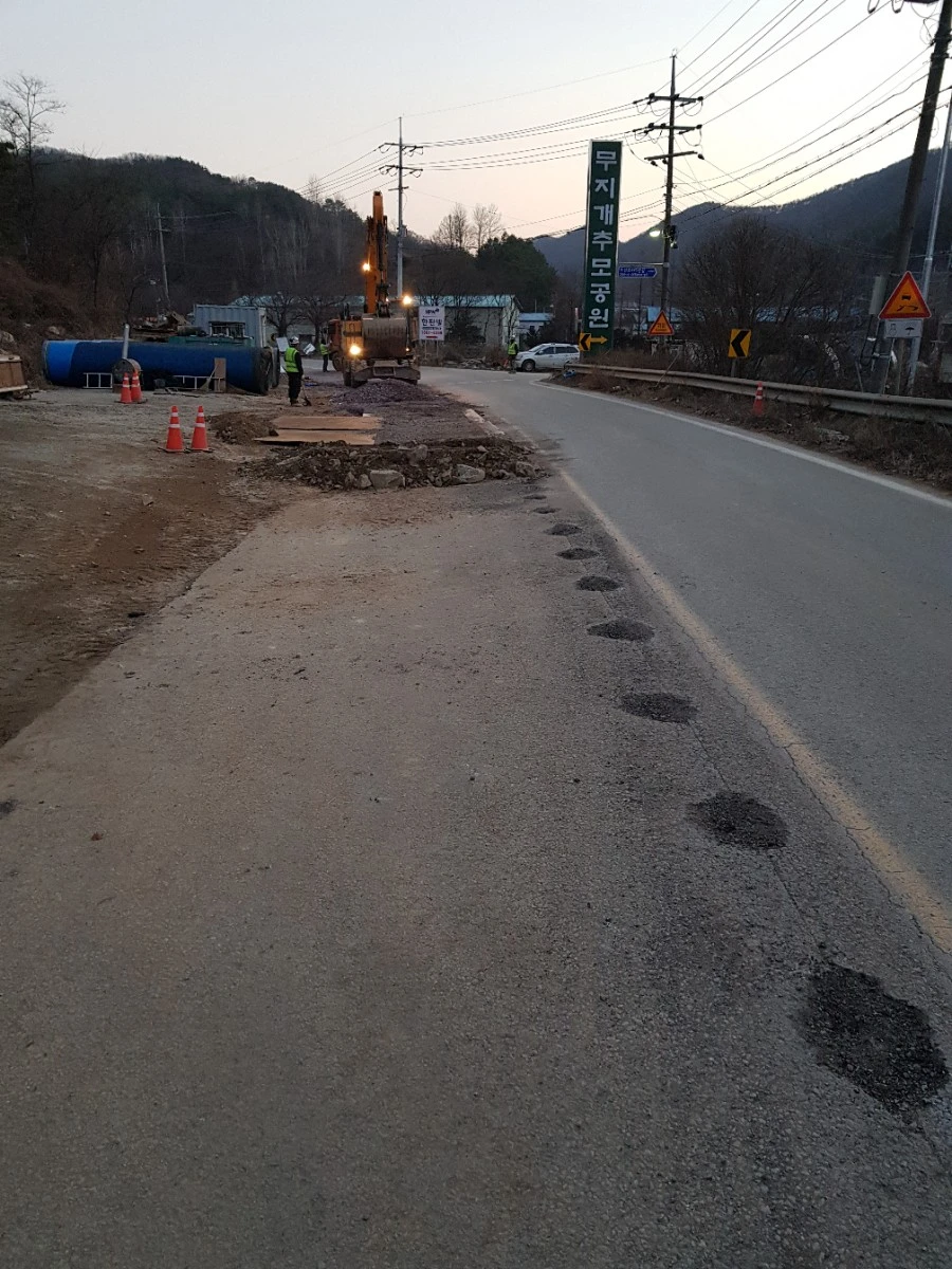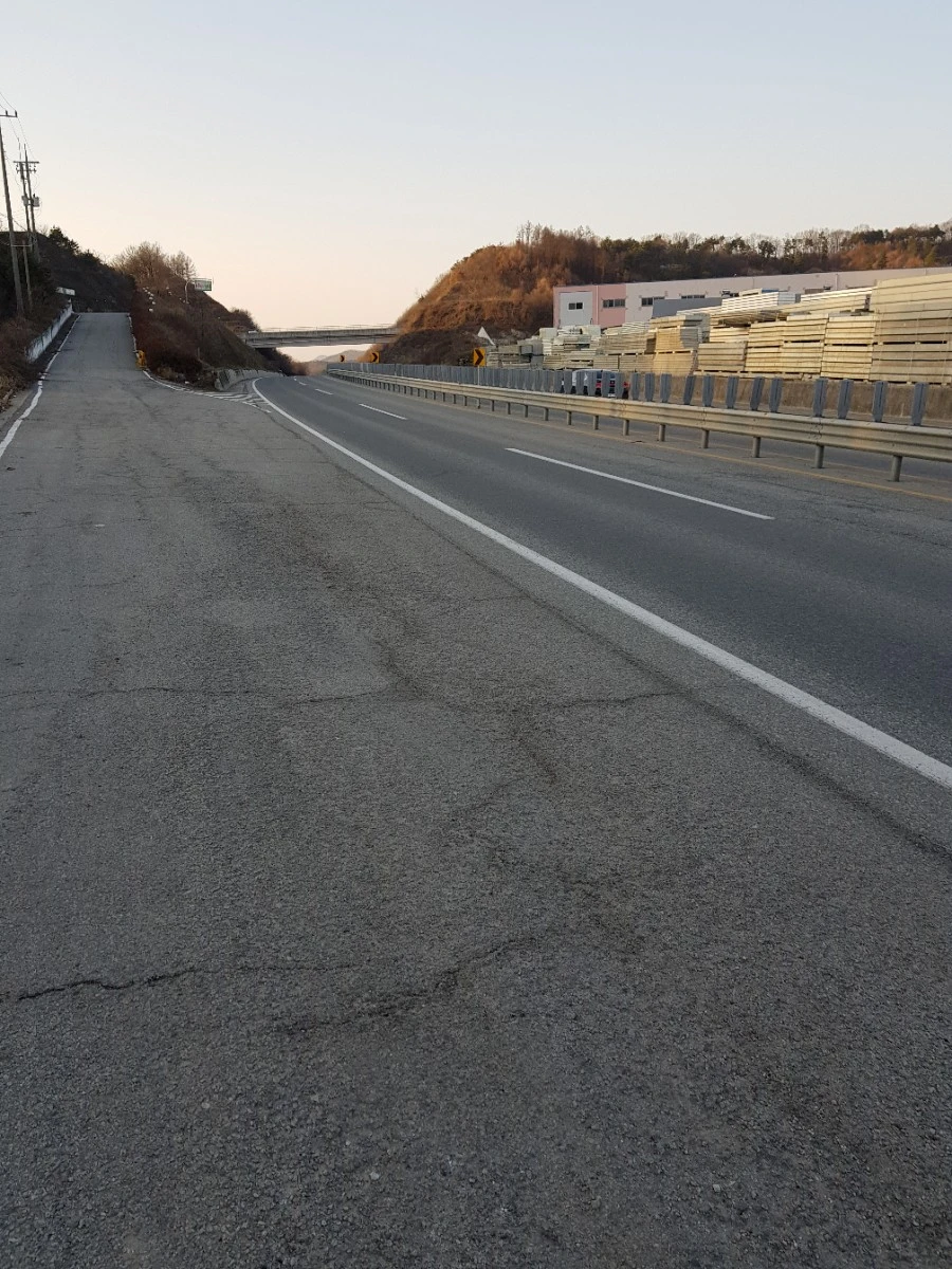 발이 너무 아파 국도를 벗어나자마자 길가에 주저앉아서 발을 매만졌다. 간간이 차가 오가는 조용한 길이지만 여기도 연말 도로공사를 피할 수는 없었다.