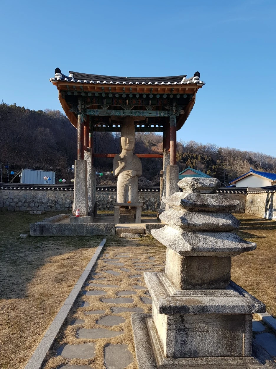 머리 위에 얹힌 모자(?)는 '보개'라 부르는 장식이다. 비바람으로부터 석상을 보호하는 역할도 한다. 보개의 높이가 높은 건 고려시대의 특징이다. 이 미륵보살은 고려시대에 송문주, 김윤후 장군을 기리며 만들어졌다. 검지를 위로 올려 든 오른손의 모습은 중생의 두려움을 없애 준다는 '시무외인(施無畏印)', 왼손은 소원을 들어주는 '여원인(與願印)'이다.