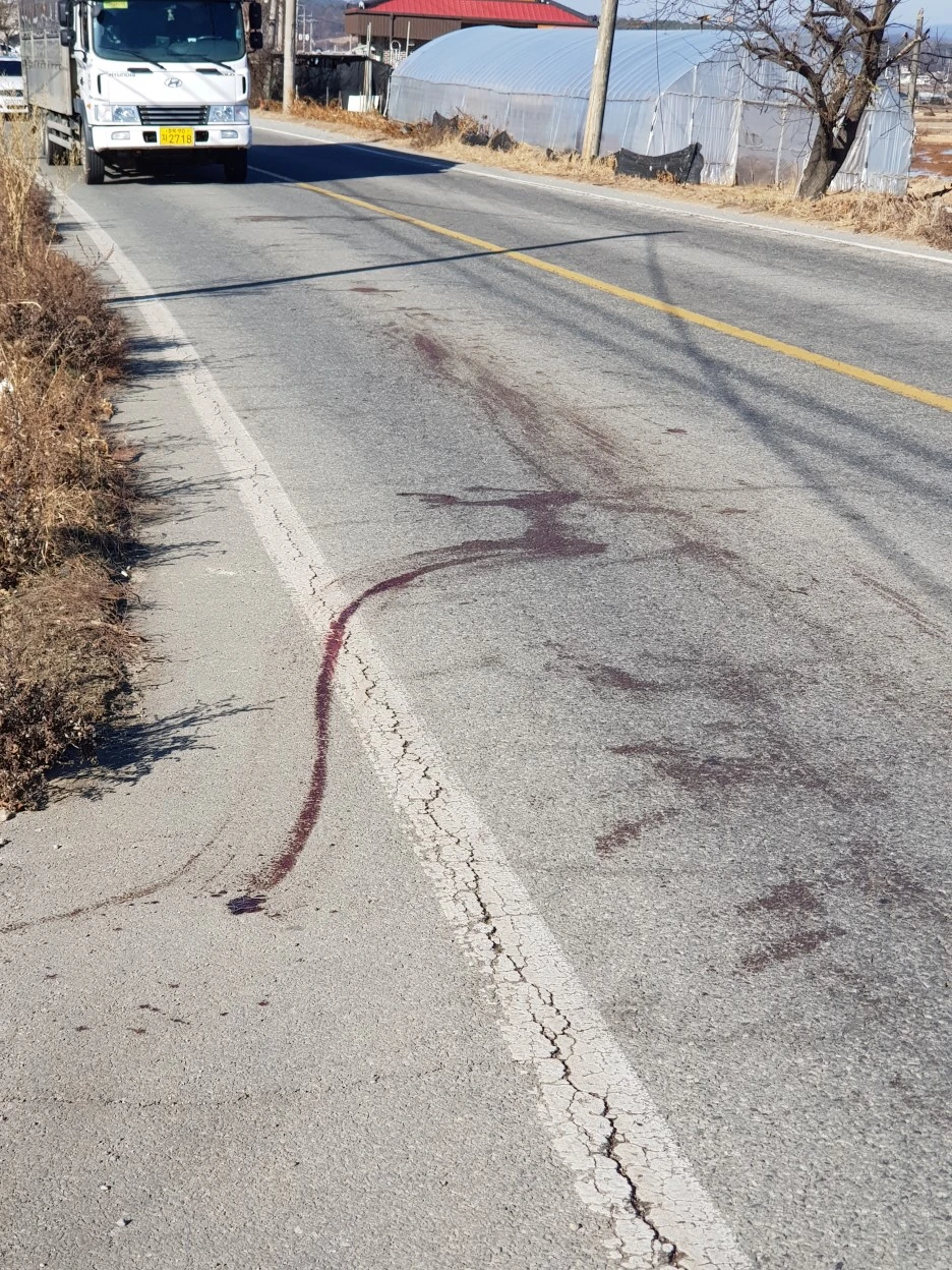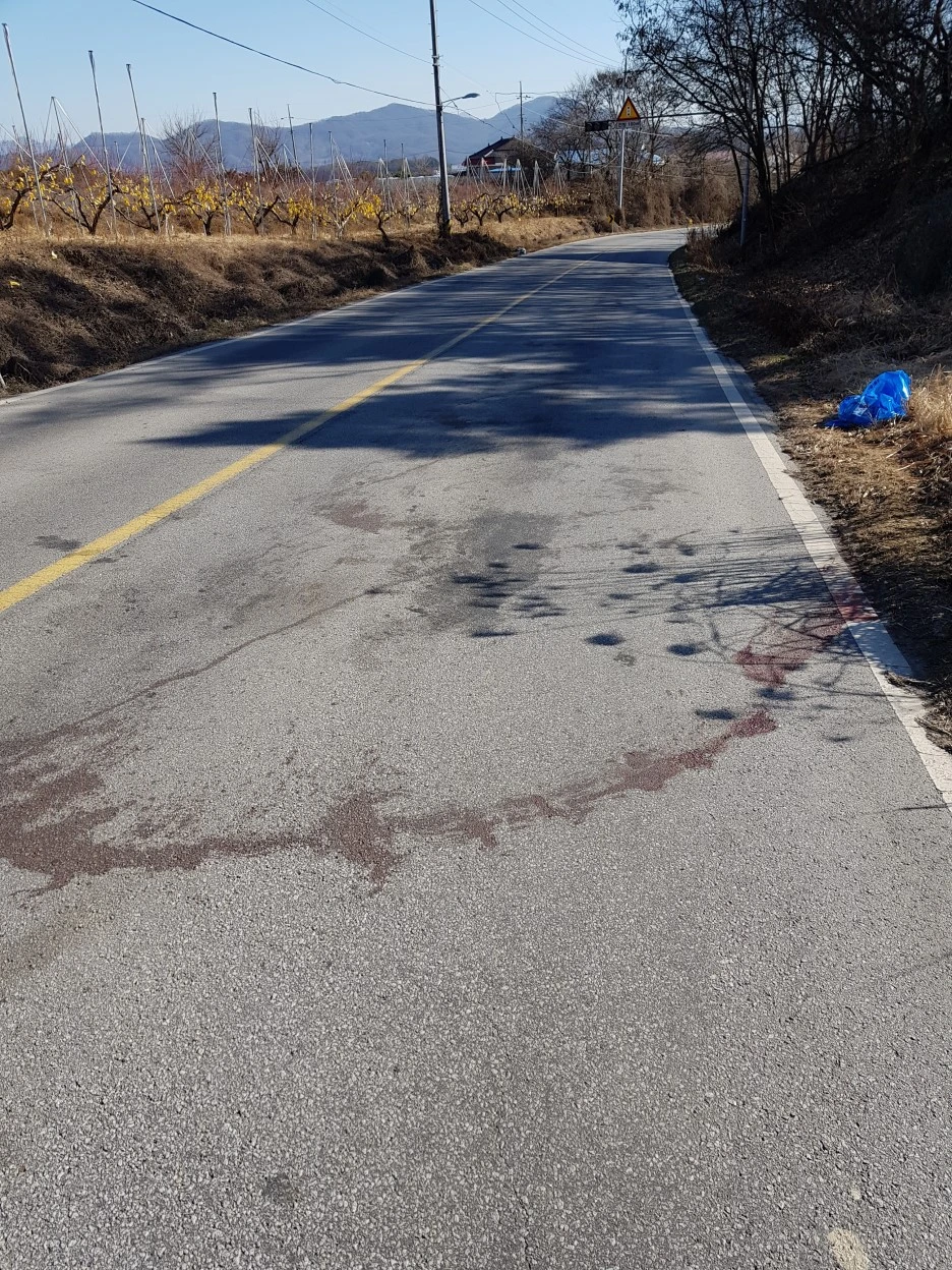 안타까운 광경이 이어진다. 고라니 사체를 본 지 정확히 10분만에 두 번째 죽음을 만난다. 사체는 보이지 않았으나 도로 위로 남은 흔적이 당시의 비극을 생생하게 드러내고 있었다.