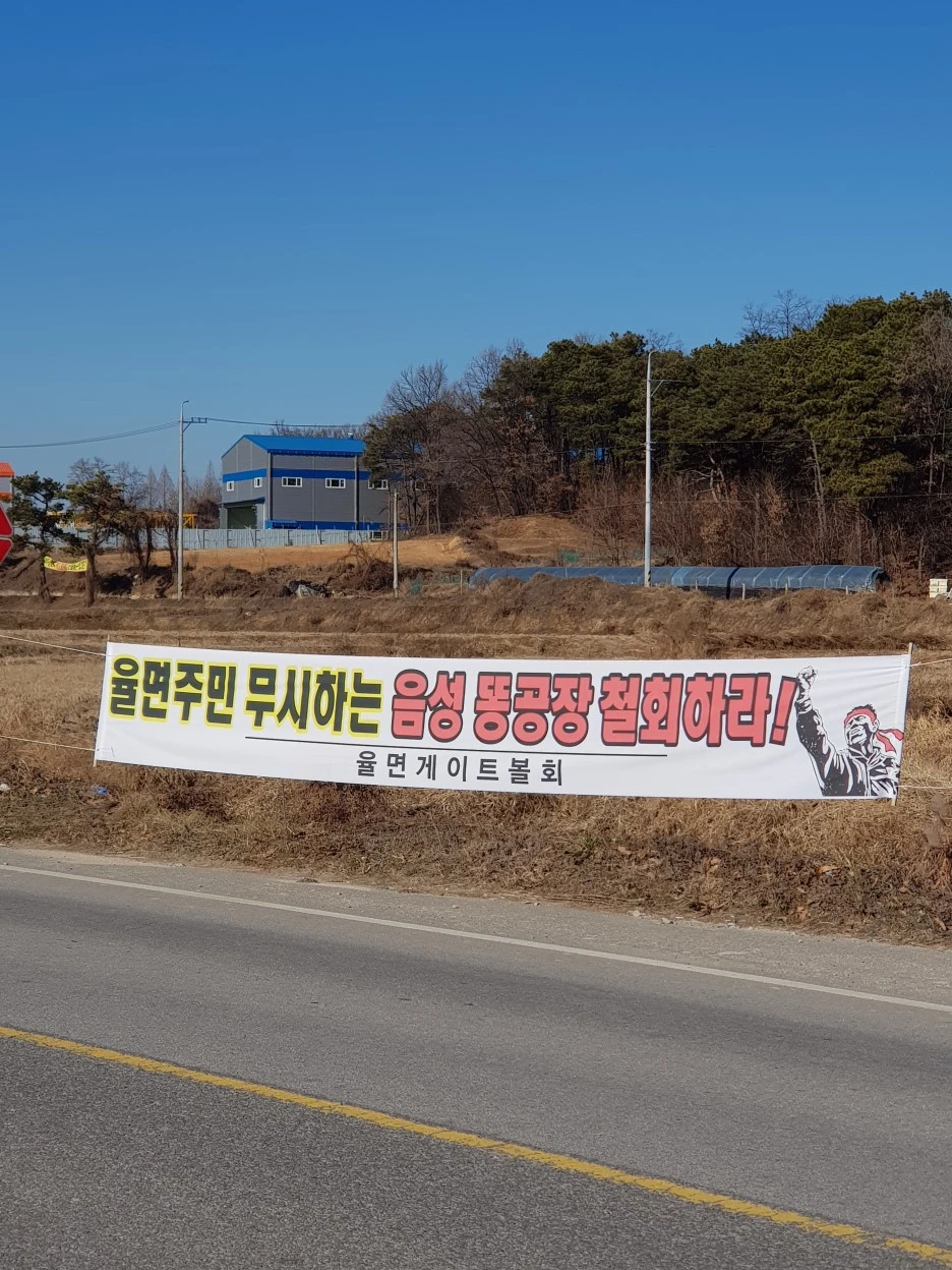 또 다른 현수막에는 지역 주민들의 분노가 담겼다. '똥공장'이란 음성군에서 나오는 가축 분뇨처리시설을 말한다. 그런데 그 위치가 이곳 이천시 율면과 가까워 음성에서 발생한 가축분뇨 처리의 피해를 이천시 율면 주민들이 받게 된다는 얘기다. ("지자체 경계 혐오시설 건설 수난당하는 이천시", <하나로신문> 2018. 11. 15. 참고) 혐오시설에 대한 주민의 반발은 어디서나 마찬가지지만 이곳의 항의는 제법 일리가 있다.