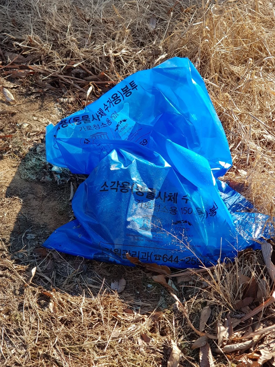야산을 끼고 도나 싶더니 아니나다를까 세 번째 죽음을 맞는다. 선명하게 남은 핏자국 옆에 '동물사체수거용 봉투'가 놓여 있다. 이런 봉투가 따로 제작되어 있다는 것은 로드킬이 그만큼 많다는 뜻이다.