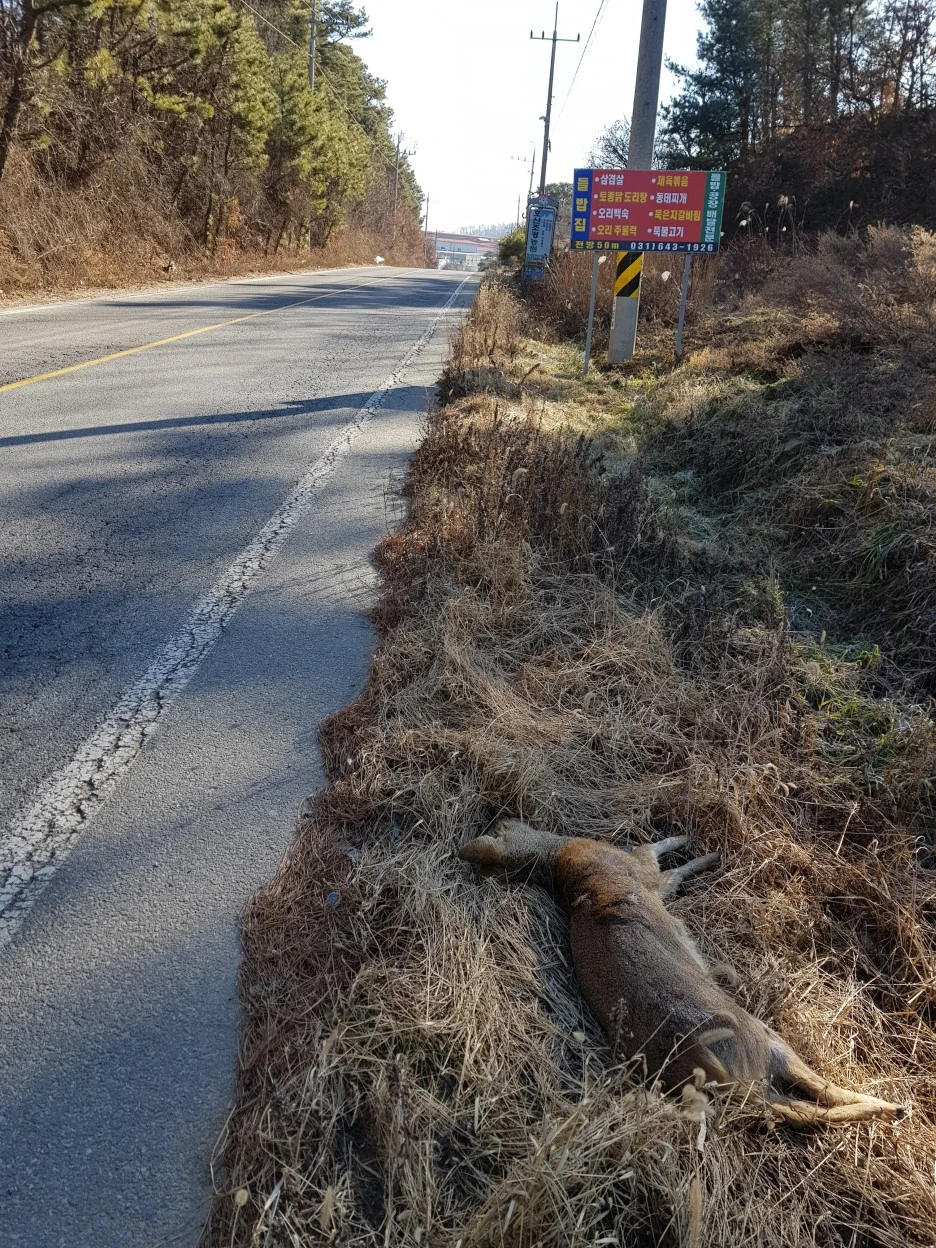 마침 멀지 않은 곳의 고라니와 눈이 마주쳤다. 나를 보자마자 폴짝폴짝 도망친다. 그렇게라도 차도에서 멀어졌으니 다행이다. 부디 도로에서 참혹한 일을 겪지 않길 바랐다.