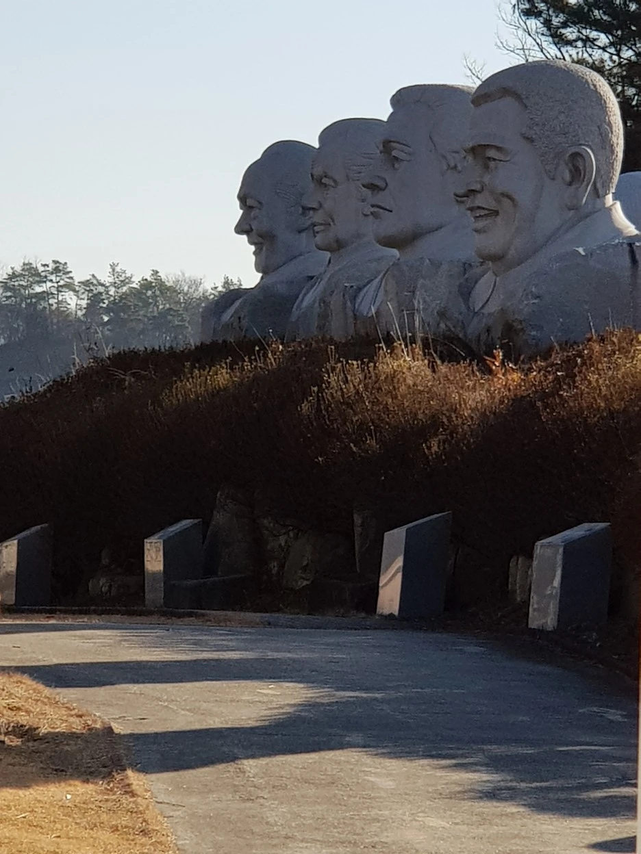 길에서 '큰바위 얼굴 테마파크'를 만났다. 담장 너머엔 얼굴 석상이 늘어서 있다. 누구나 알 만한 동서고금의 위인들이다. 테마파크의 창립자는 미국 작가 너새니얼 호손(Nathaniel Hawthorne)의 '큰바위 얼굴'을 염두에 둔 것 같다.