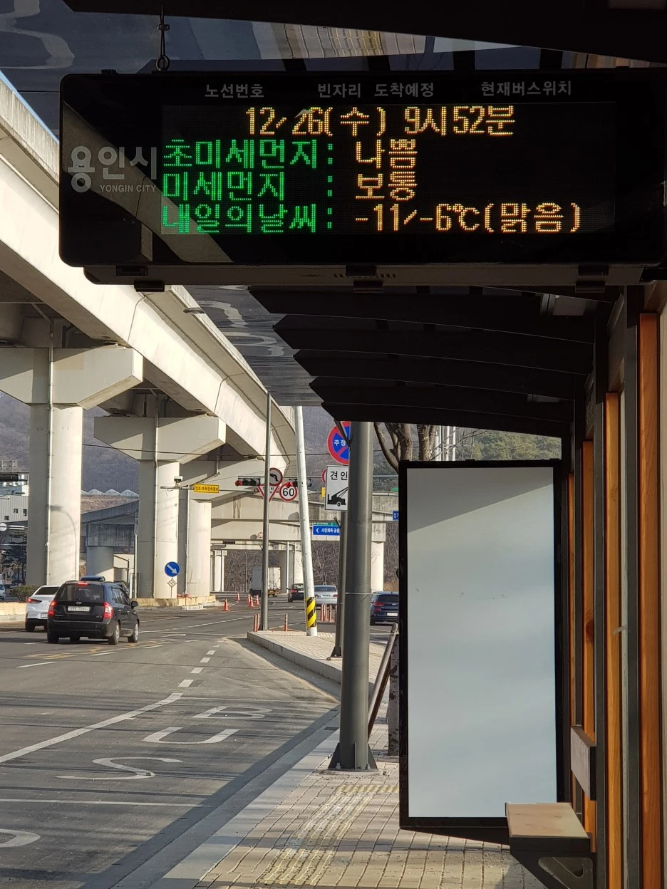 여기까지 딱 한 시간 걸었다. 버스정류장 벤치에 앉아 물을 마시고 숨을 돌린다. 내일은 기온이 뚝 떨어질 예정이다. 정류장 전광판에도 일기 예보가 떴다.