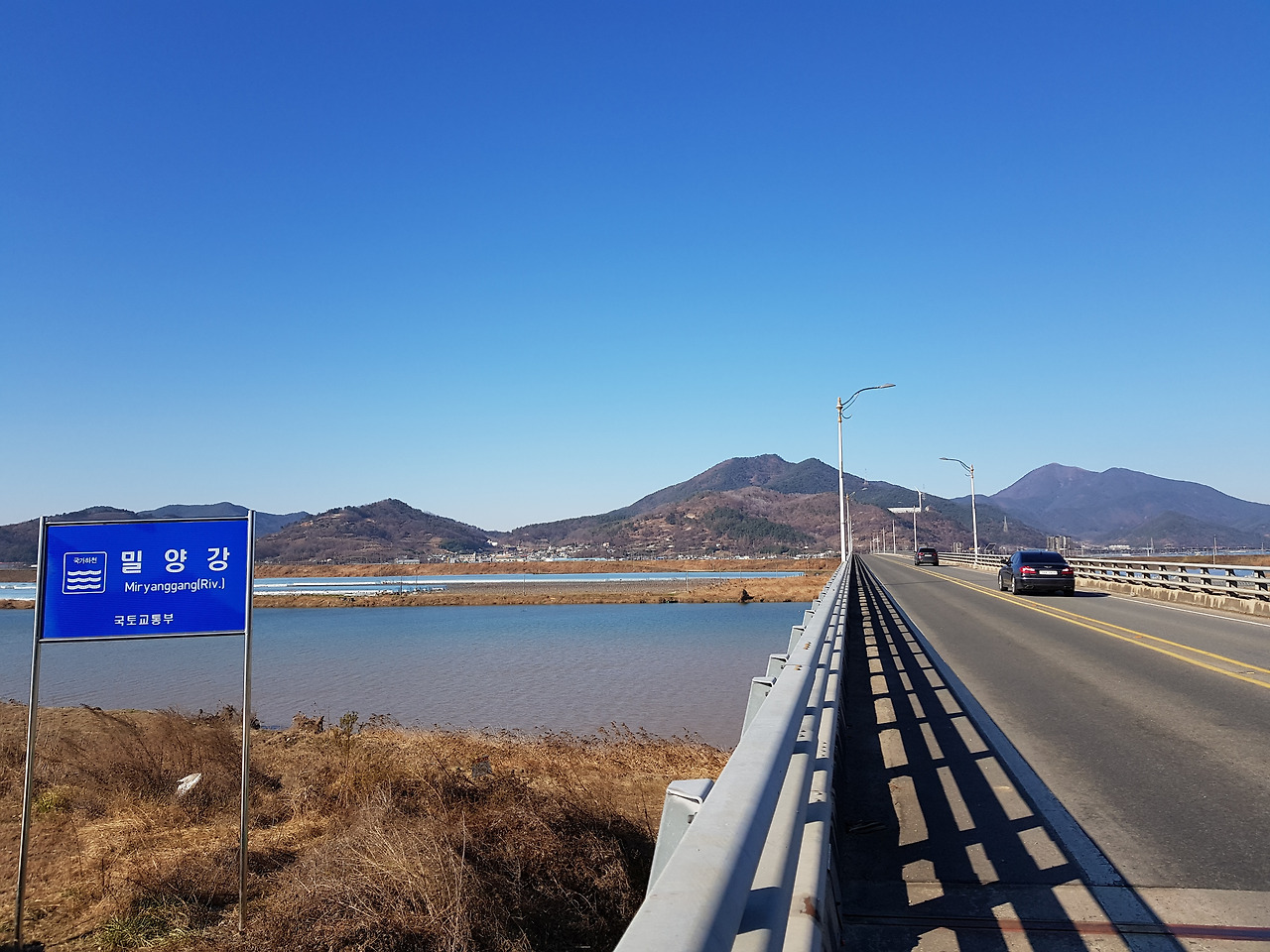 다시 다리를 건너 조금 더 밀양의 중심부 쪽으로 향한다. 이렇게 강을 계속 건너는 이유는 밀양강이 이 지역을 굽이굽이 감싸고 있기 때문이다.