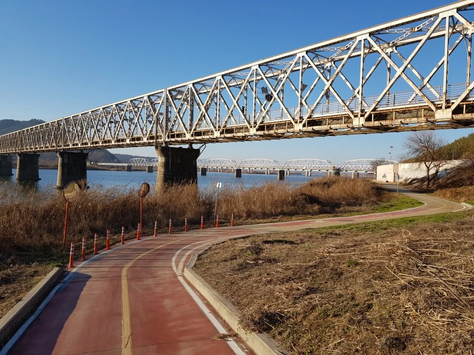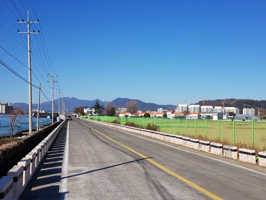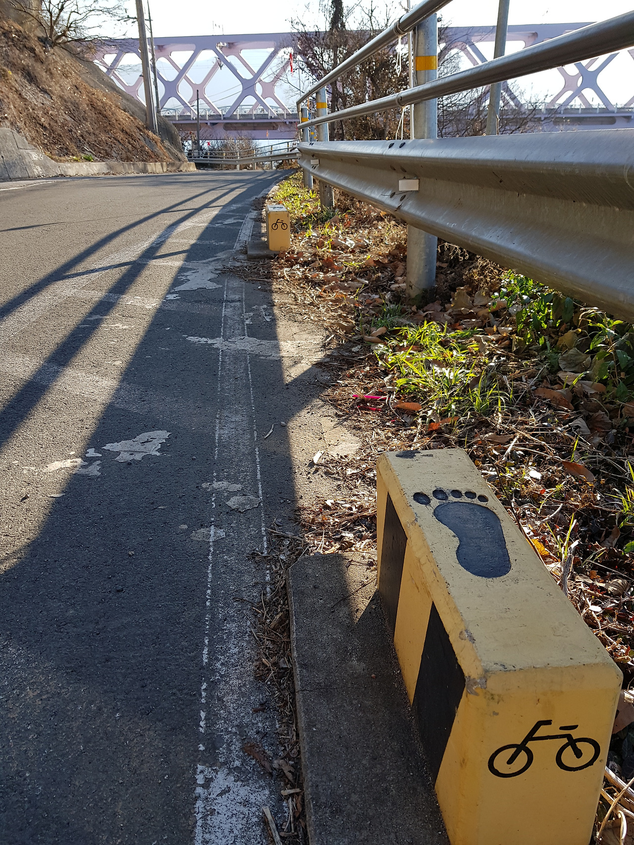 야트막한 제방을 오르자 왼편으로 자전거길이 분리되어 나갔다. 자전거길은 일반 도로에 비해 차량이 없어 걷기에 안전하다. 하지만 이렇다 할 볼거리가 없어 지루하다.