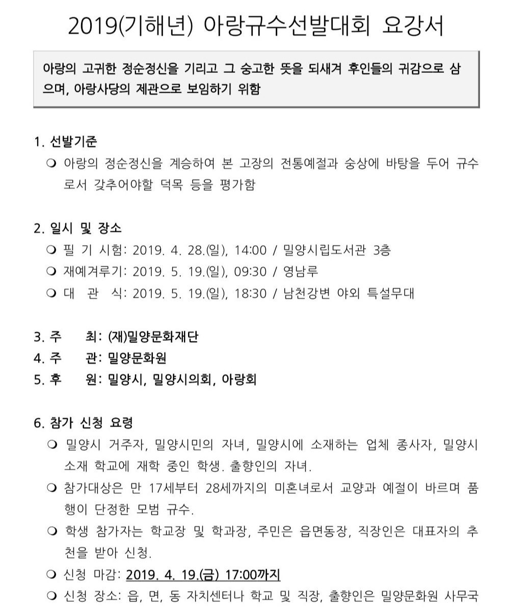 이런 생각은 나만의 것이 아니다. 아랑규수 선발대회가 시대착오적이라는 비판은 여성단체를 중심으로 꾸준히 제기되고 있다. (참고기사 : "여성단체 "밀양 아랑규수 선발대회 즉각 중단하라"", <여성신문>, 2019. 05. 17.)