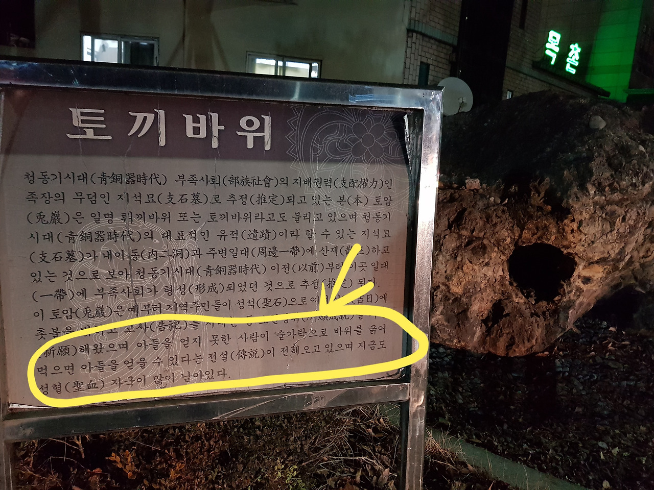 큰길에서 모텔촌으로 접어드는 길에 재미있는 바위를 만났다. '토끼바위'로 불리는 청동기 시대의 고인돌이다. 예부터 소원을 들어준다 하여 여인들은 아들을 낳기 위해 바위를 긁어 먹기도 했단다.