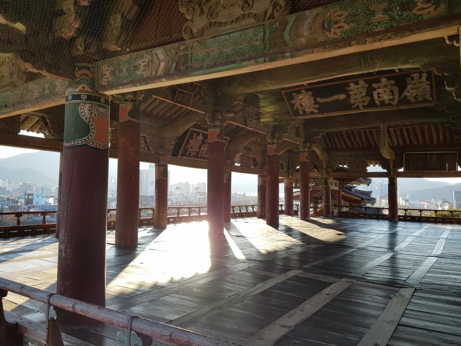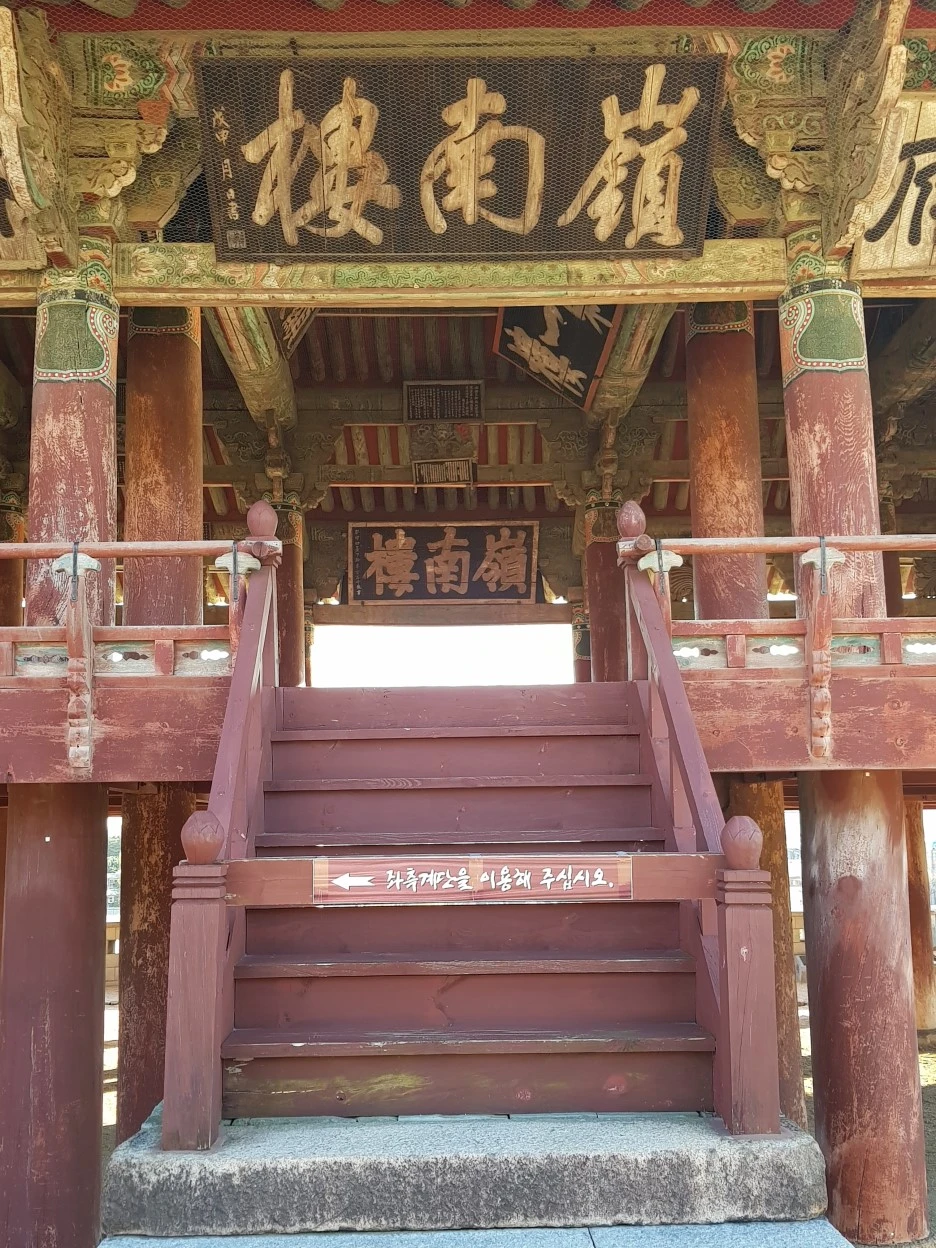영남루는 자태도 아름답지만 바로 아래 밀양강을 둔 데다 주변에 시야를 가리는 것이 없어 누각에 앉으면 호쾌한 전망이 가능하다. 올라가는 계단에 지그재그식 경사로를 둔 것도 재미있다. 누각 안쪽으로는 '영남제일루'라 쓰인 현판이 보인다.