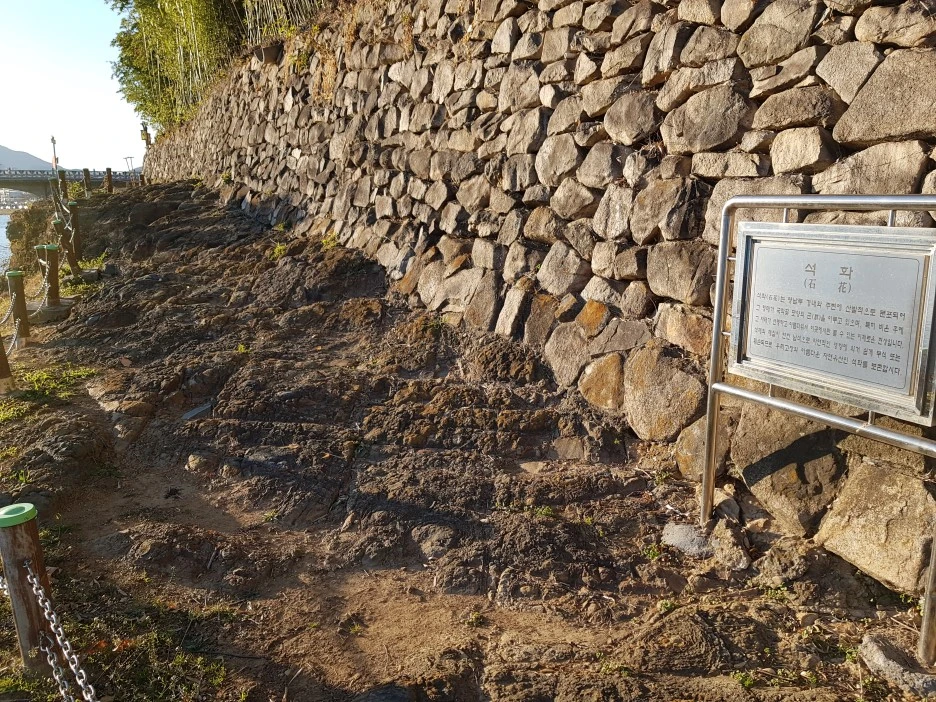 영남루 아래로 아랑사가 있고, 아랑사 아래 강변에는 '석화'라 불리는 기이한 무늬의 돌이 보호시설로 둘러싸여 있다. 표면이 마치 꽃무늬처럼 풍화된 암석이다.