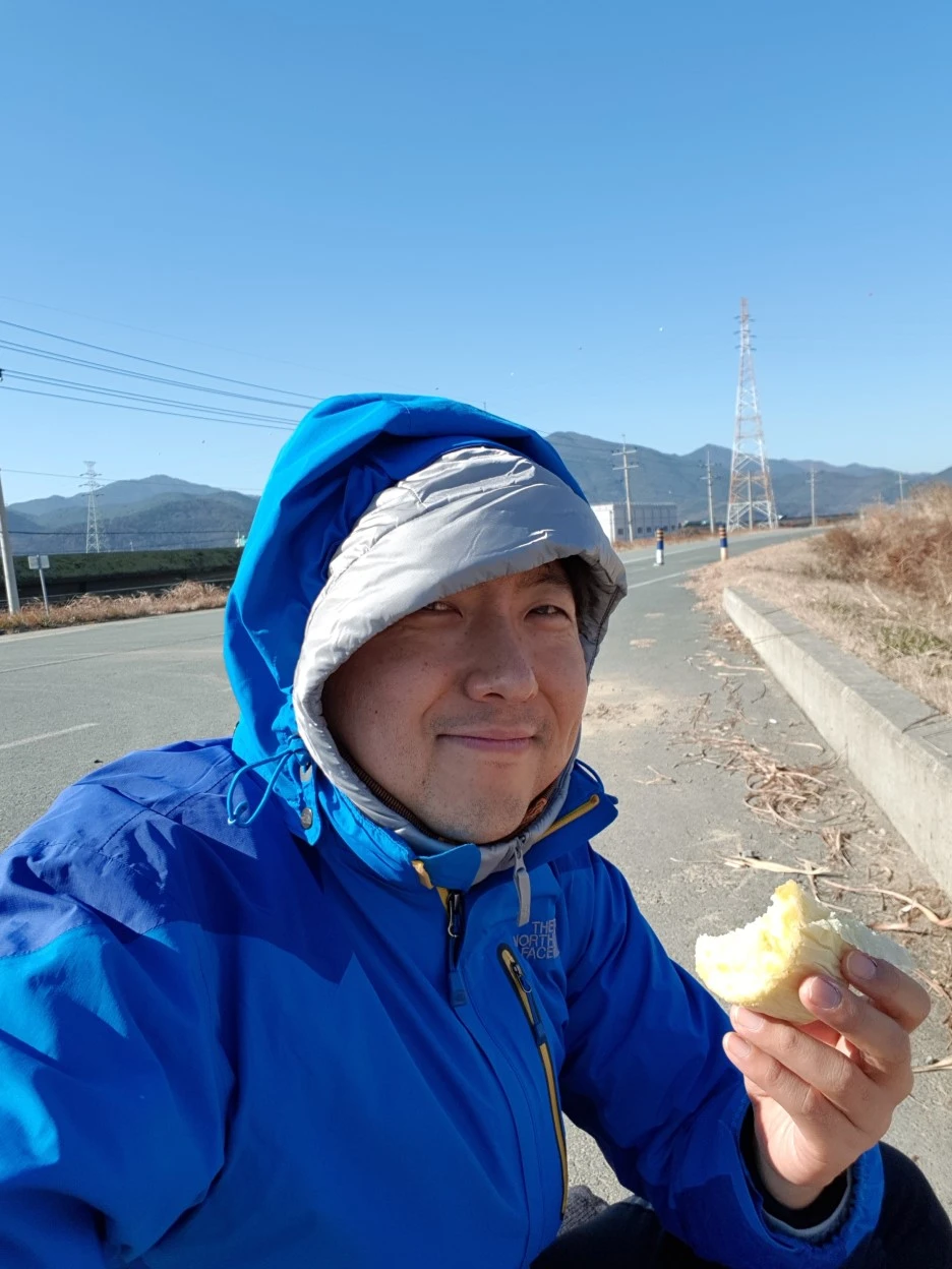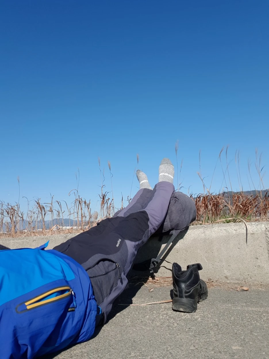 발의 고통을 견디고 찬바람을 맞으면서 한낮까지 걷다 보니 어느 순간 급속도로 피로감이 몰려왔다. 간밤 잠을 설친 것도 한몫했으리라. 결국 한적한 길바닥에 드러눕고 말았다.