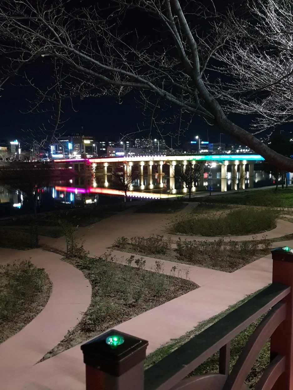 사우나를 마치고 나서니 해가 졌다. 밀양강이 다리의 오색 불빛에 물들고 있었다.