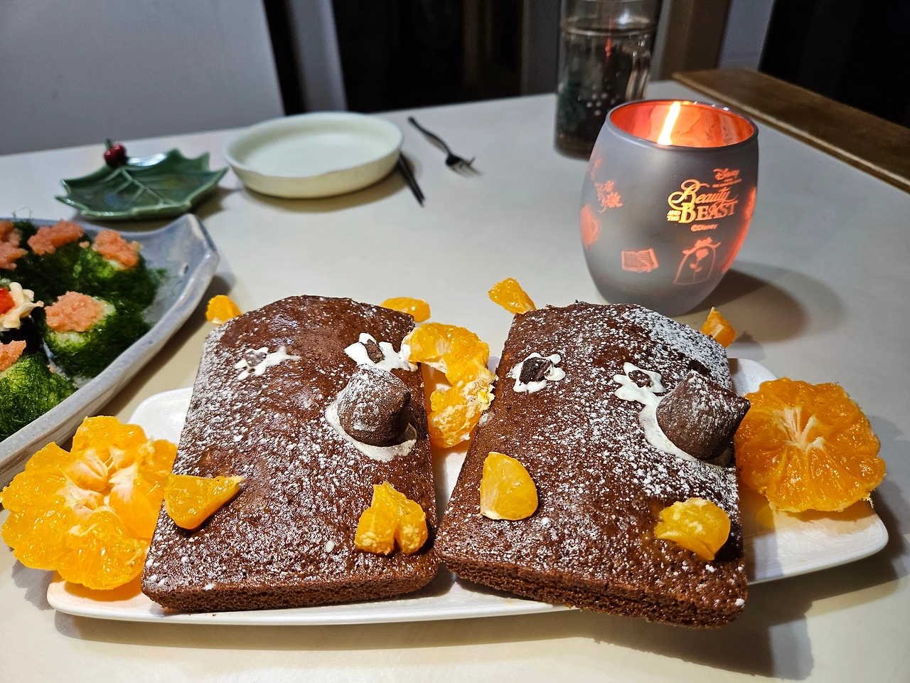 딸애는 두 번째로 구워진 초코파운드케이크를 반으로 잘라 루돌프로 꾸몄다. 그리하여 탄생한 우리의 '미리 크리스마스 다이닝 리미티드 에디션.'