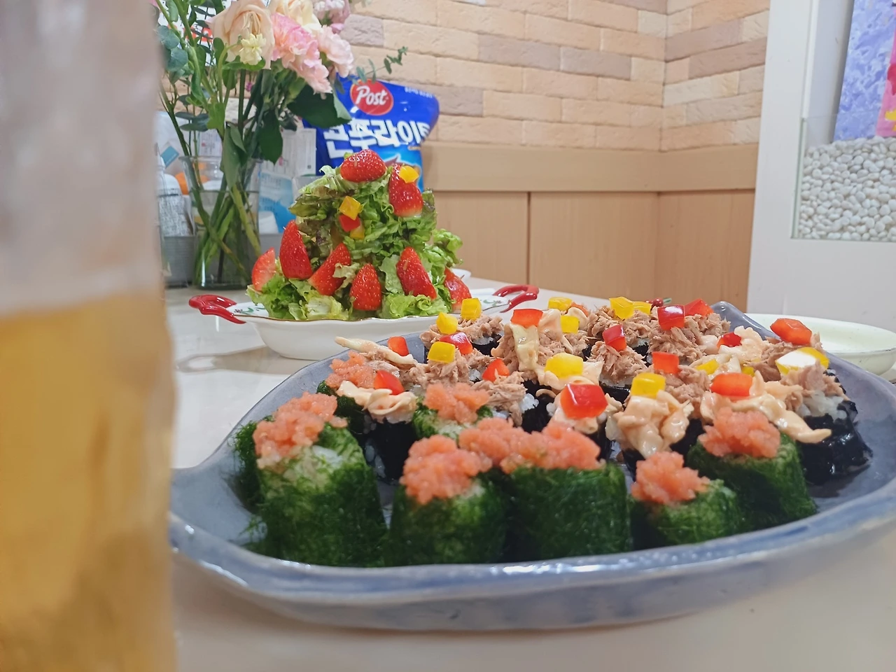 잘 구워진 케이크 시트를 뒤집어 철망에서 식히는 동안, 남은 반죽에 제티 2봉을 넣고 섞어 파운드케이크 틀에서 2차로 구웠다. 딸애가 데코를 위해 휘핑크림과 씨름하는 사이, 나는 밥에 간을 하고 김으로 돌돌 만 다음, 한 입 크기로 잘라 참치와 양배추샐러드를 올렸다. 감태는 첫 시도니까 딱 한 줄만. 역시 한 입 크기로 썰어 감태롤에 들기름과 통깨와 백명란을 섞어 한 젓가락씩 올렸다. 네모나게 자른 노랑 빨강 파프리카로 화룡점정.