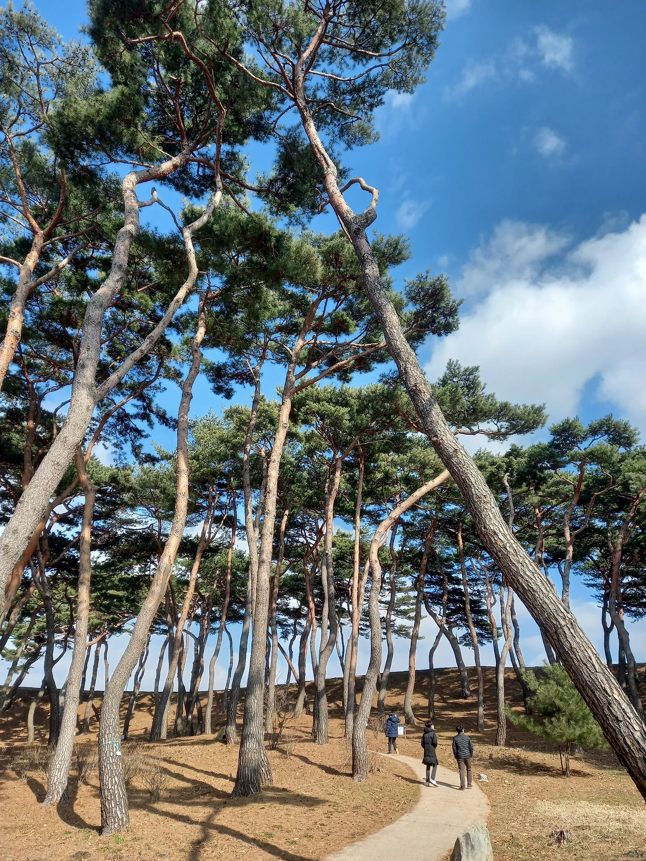 시선을 거두고 사방을 둘러보았다. 머리 위로 맑고 파란 하늘이 펼져져 있었다. 언덕의 네 갈래 길을 따라 숱이 풍성한 소나무들이 높디높게 서 있었다. 흡사 무리를 지은 식물성 기린이었다. 앞서 걷는 남편과 두 애를 멀찍이 바라보았다. 청량한 바람이 가슴 속으로 쉬지 않고 흘러들었다. 흠. 솔바람을 깊이 들이마셨다.