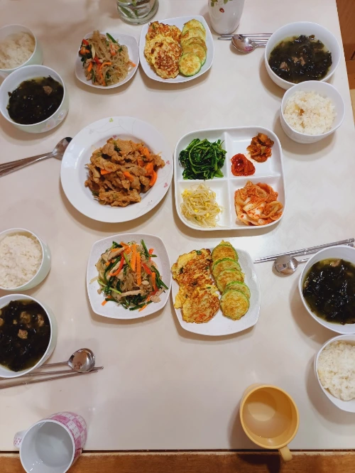 그래도 진짜 생일은 오늘인데 그냥 넘어갈 수는 없었다. 오전부터 음식할 여건이 안 되었으므로 전날 저녁 부지런을 떨었다. 미역을 불리고 소고기를 물에 담가 핏물을 뺐다. 마늘을 쓸 만큼만 다지고 채소들을 다듬었다. 미역국을 끓이고 크레미팽이버섯전과 애호박전을 부치고 잡채를 하고 부추나물을 무쳤다. 맵지 않게 제육볶음을 하고 참외를 깎아 씨를 긁어 내어 먹기 좋게 잘랐다. 남편이 도착할 시간에 맞춰 밥솥에 쌀을 안쳤다.