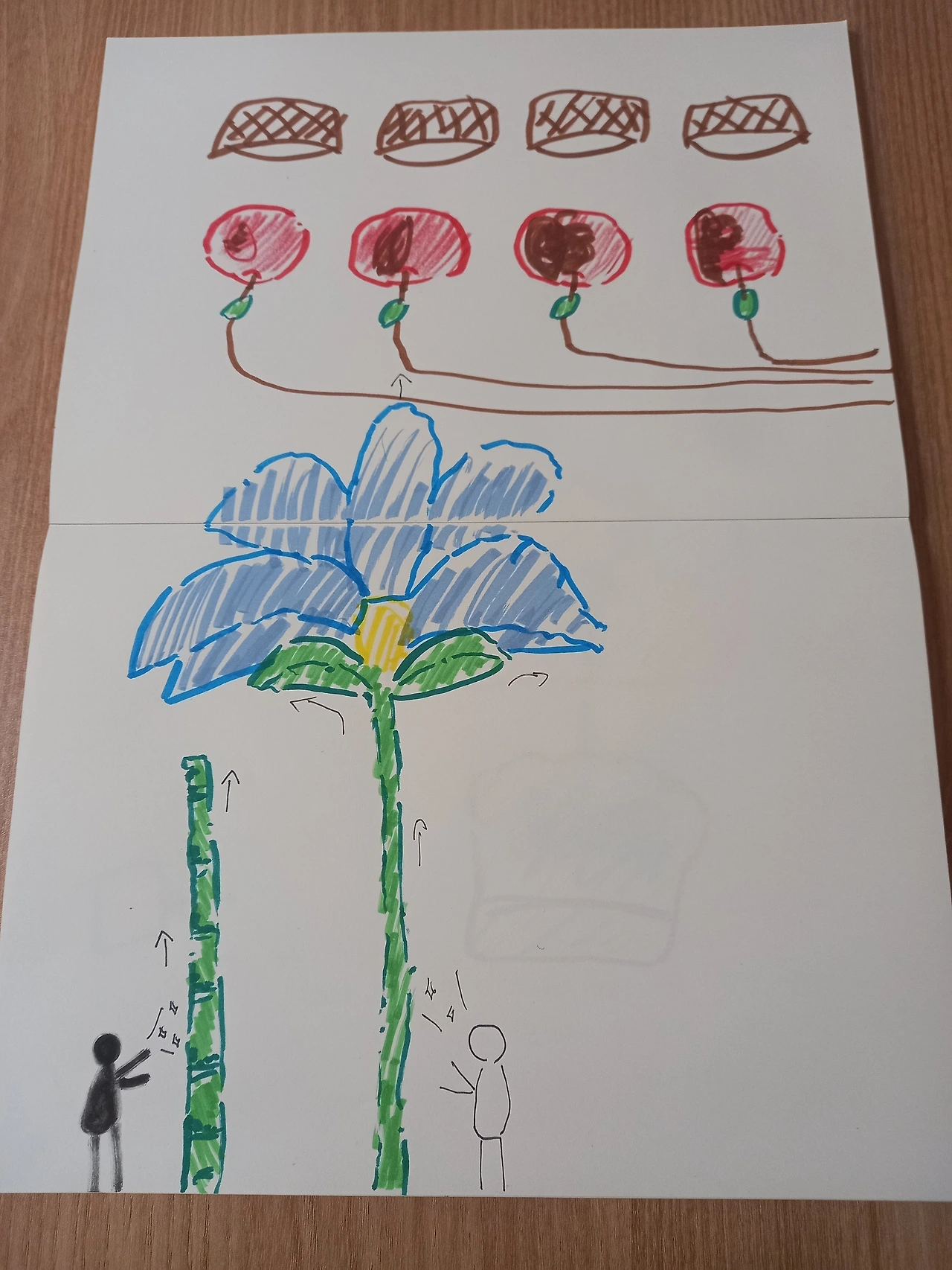 -저에겐 딱딱하고 속이 비어 공허한 대나무도 있어요. 애벌레가 사과를 갉아 먹으면 더 꼿꼿하고 점점 키가 커져요. 그런데 사과가 멀쩡해지면 대나무에 꽃이 피어요. 딱딱한 대나무도 나고, 꽃이 핀 대나무도 나예요. 꽃이 활짝 피어서 오늘은 학교에 갈 수 있었어요.
