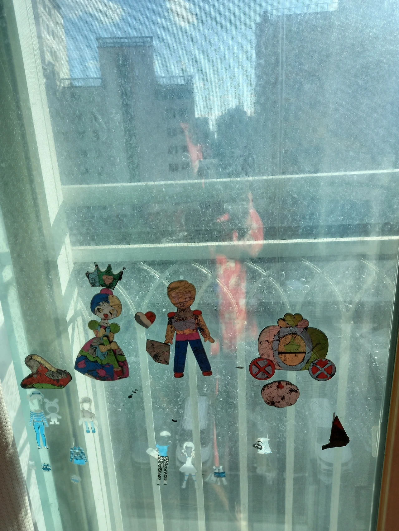 커튼을 치니 다 삭은 스티커가 바래 있다.