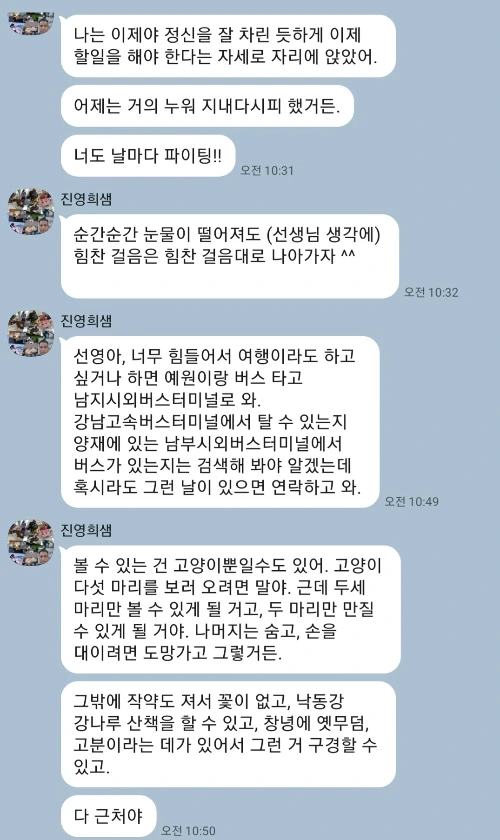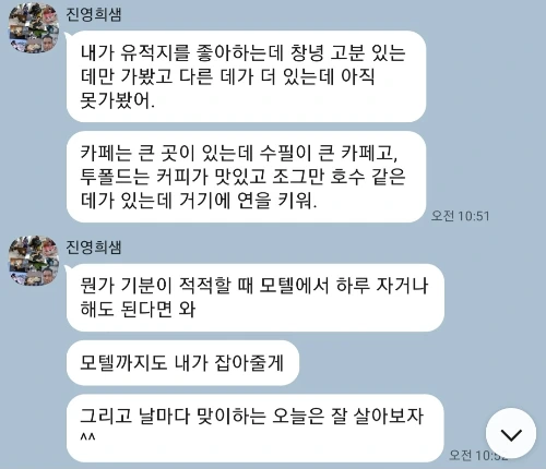 생애 첫 강연을 마친 다음 날 영희에게서 톡이 왔다. 정성 들여 적은 마음에 두 눈이 뜨거워졌다. 흡. 울음을 삼키고 가만가만 읽었다.