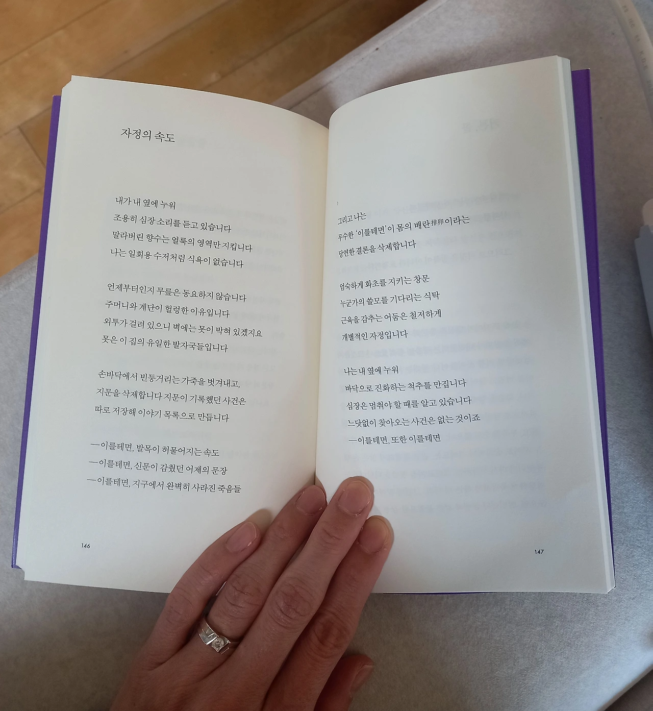 2025년 11월 16일 오후. 박 시인님의 영정 앞에서 말문이 막혔다. 남편과 국화를 올리고 물러나 눈을 감았다. 편히 쉬세요. 고생 많으셨어요. 몸을 돌리자 검은 한복을 입은 영수 선생님이 고개를 끄덕였다. 고개를 숙이고 힘주어 눈을 감았다. 안 알렸는데 어떻게 알고 왔어? 어젯밤에 웹진에서 봤어요. 시인님의 동생분께 인사를 드리고 접객실로 이동했다. 수척한 선생님의 모습에 마음이 아렸다. 그동안 얼마나 힘든 시간을 보냈을지 짐작조차 되지 않았다. 연명 치료를 안 했다면 더 빨리 갔을 수도 있고 그랬다면 그때 나름대로 후회였을 거라는 말씀에서 깊은 회한이 묻어났다. 마지막에 너무 아프게 가서. 너무 힘들게 가서. 그게 가슴이 아파. 나는 아무 말도 할 수 없었다. 연애 시절, 사랑의 마음을 담아 시를 써서 편지로 주던 낭만적인 시인님은 눈감을 때까지 얼마나 가슴이 아프셨을까. 영수야. 자신의 이름을 따뜻이 부르는 남편의 육성을 듣지 못한 채 떠나보내야 했던 선생님은 또 얼마나 사무쳤을까. 자꾸만 목이 메었다.