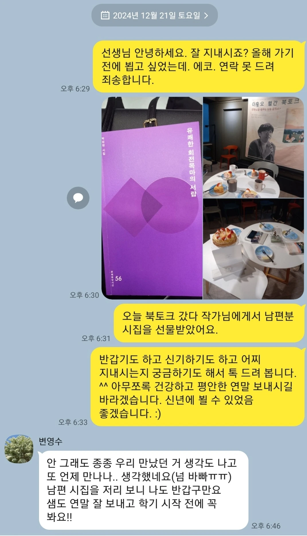 2025년 11월 15일 토요일 밤. 저녁 설거지를 미룬 채 이웃 블로그를 휙휙 넘기고 있었다. 그러다 눈에 들어온 <<시인광장>> 웹진. 눈을 비비고 다시 봤다. 하...... 익숙한 얼굴을 스크롤하자 부고가 나타났다. 내가 아는 그분. 박성현 시인에 대한 소식이었다. 당혹감과 안타까움과 안쓰러움에 남편이 쉬고 있는 아들 방 문 앞에서 노크를 망설였다. 문을 열었지만 입을 떼지 못하고 남편 눈을 오래 바라보았다. 왜? 무슨 일이야? 남편이 몸을 일으켜 물었고 내일 장례식장 가 봐야 할 것 같아. 영수 선생님 남편분 돌아가셨어. 빈소가 마련된 곳을 이야기하고 문을 닫았다. '영영클럽' 단톡방을 열었다 닫았다 열었다 닫았다.