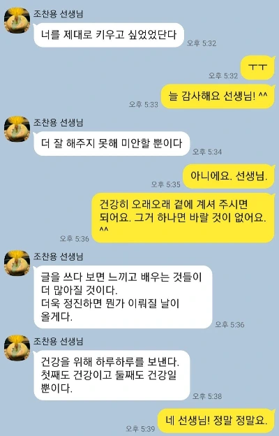 한 번도 말하지 못했다. 뭐가 그렇게 힘든 것인지. 왜 시가 쓰고 싶은지. 왜 소설을 쓰고 싶은지를. 그러나 선생님은 알고 계신지도 몰랐다. 어느 날엔가 선생님께서 카톡 메시지를 보내셨다.