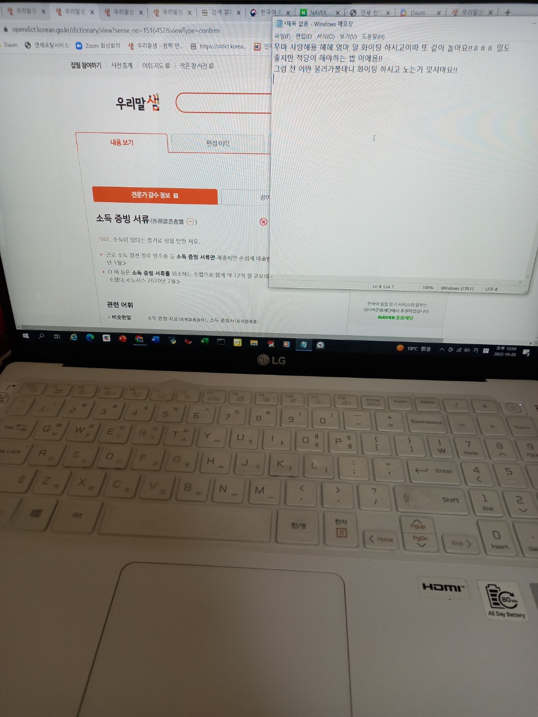 격리 밥상점심을 차려 방에 넣어 주고, 부엌에서 따로 밥을 먹었다. 설거지를 마치고 다시 책상 앞에 앉았는데 세상에나. 예쁜 쪽지가 메모장에 띄워져 있다.