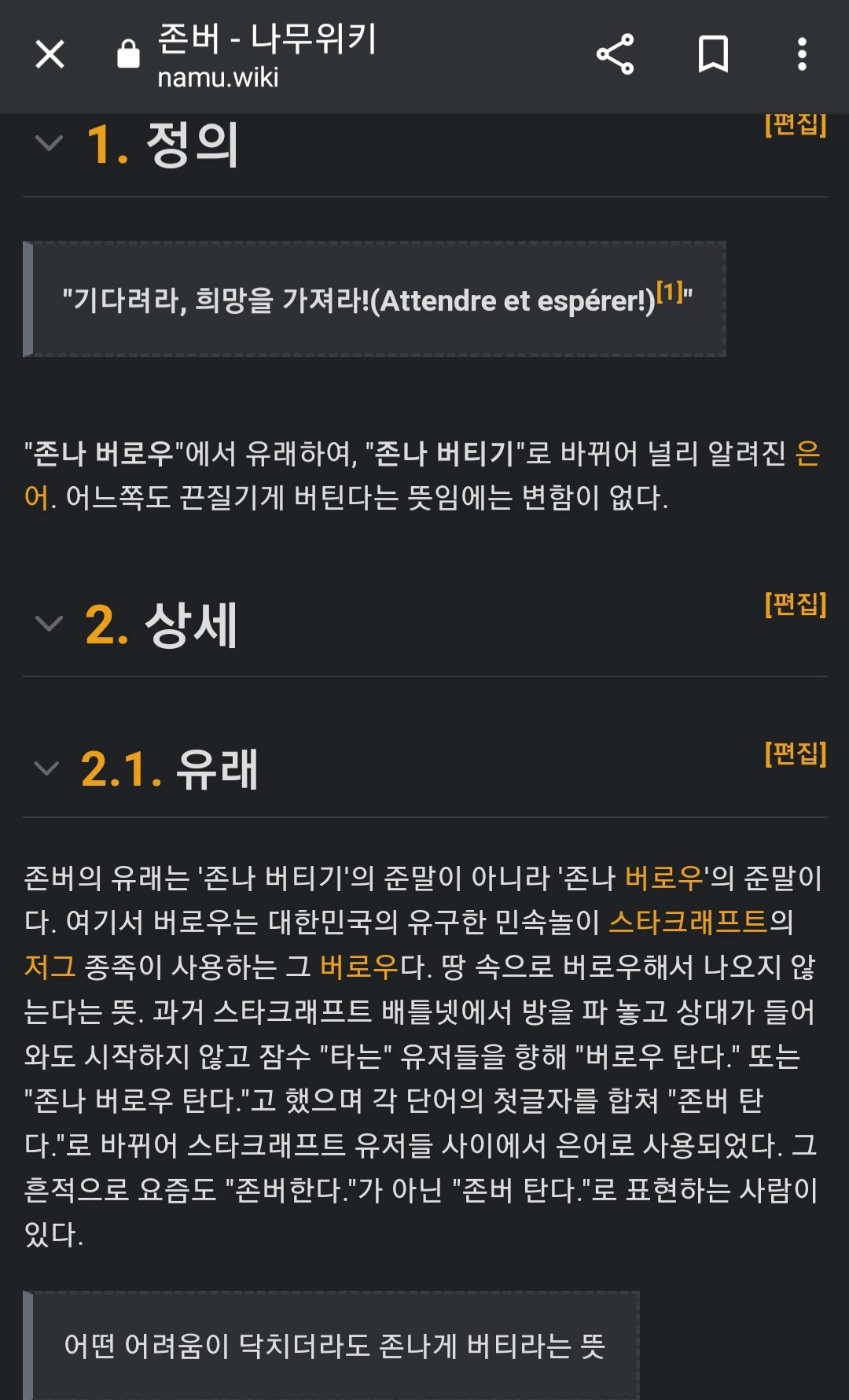 비속어가 포함된 두음절어, 존버. 이른바 '존나 버티기'의 줄임 말. 20년 이상 살았지만 그 뿌리를 두고 왈가왈부 영 말이 많은 말. 그중 가장 많이 거론되는 건 저 둘이다.