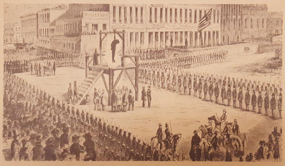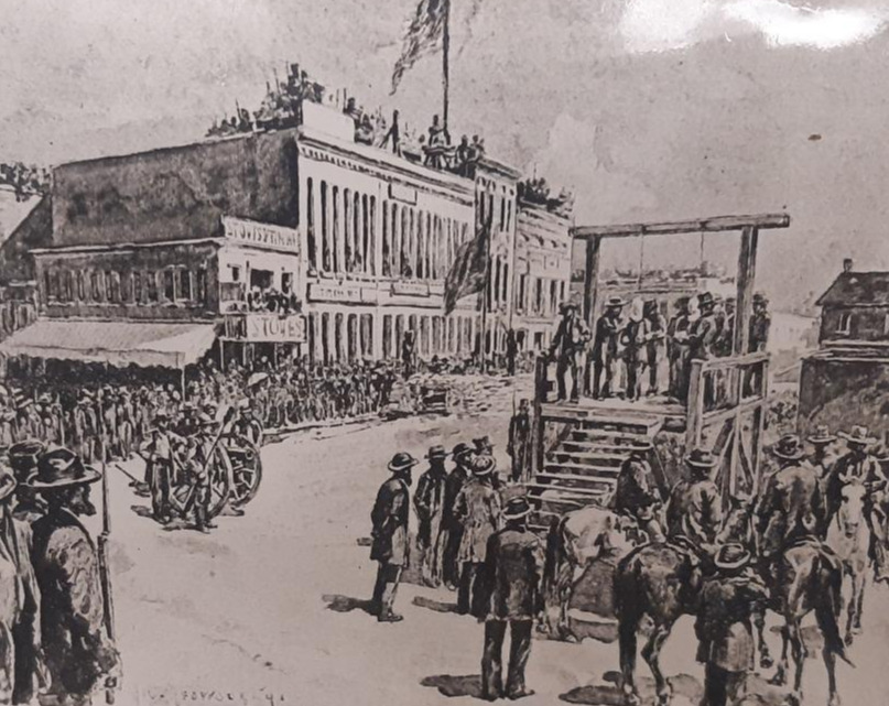 전시는 당시의 중범죄였던 말 도둑을 교수형 시키는 그림으로 시작한다. 말을 훔쳤다고 공공장소에서 교수형을 시키다니. 무법천지가 되기 쉬운 서부개척 시대에 매우 엄격한 법집행을 통해 본보기를 보여주려고 했던 것이 아닐까 싶다. 아래 그림에서 보듯이 교수형을, 그것도 많은 군중이 보는 앞에서 행한 이유가 그것일 것이다.