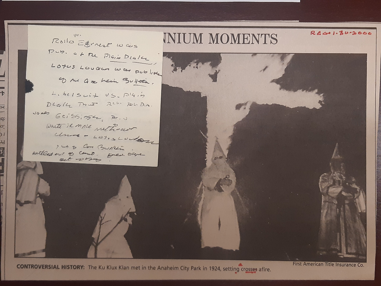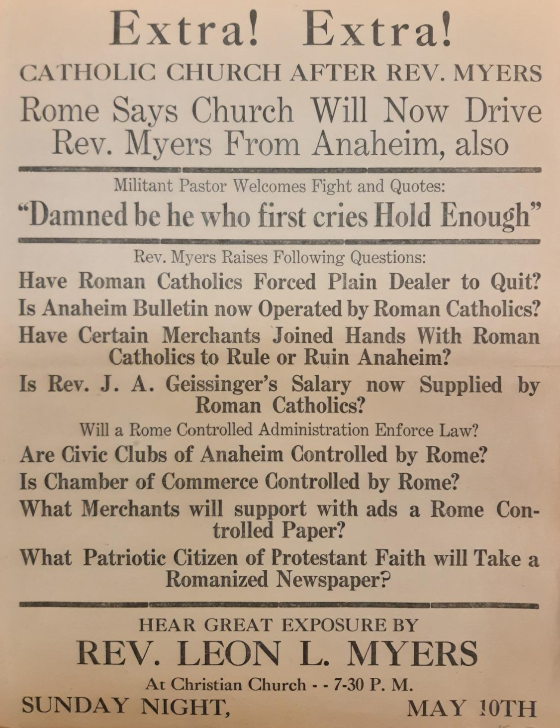 다음으로 본 것은 자신들의 교회와 애너하임 시민사회에 대한 로마 가톨릭 교회의 간섭과 Myers 목사를 쫓아내려는 시도에 저항하자는 1925년의 전단지였다. 정확히는 알 수 없지만 가톨릭 교회가 애너하임의 Myers라는 목사(신부가 아니고 목사, 즉 Reverend라고 되어있어 조금 의아하다)를 쫓아내려 하는 데, 몇몇 상인들과 결탁하고 언론사를 통제하려는 로마 가톨릭에 대해 Meyers 목사가 문제를 제기했던 것으로 추정된다.