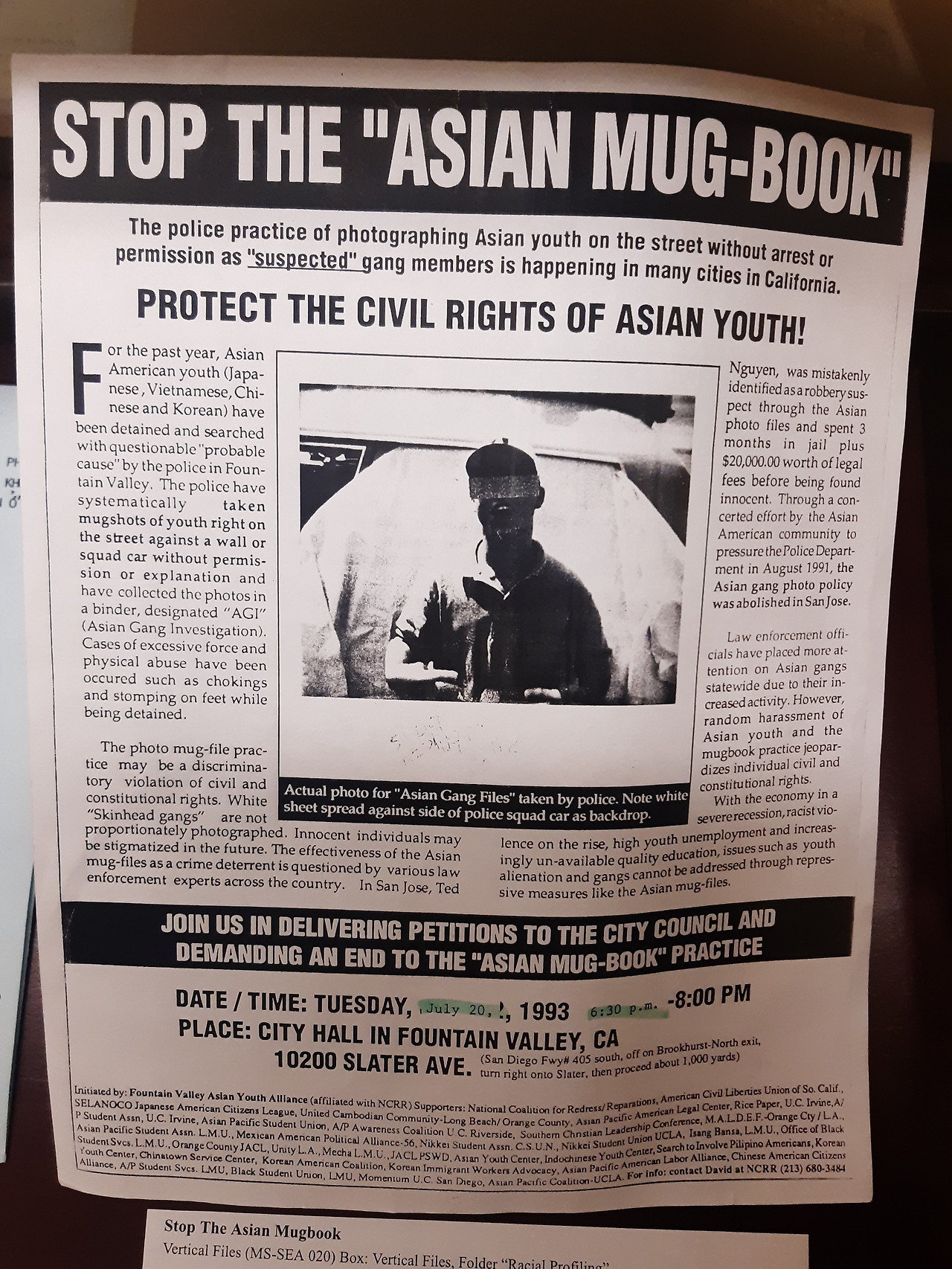 1993년에는 경찰이 아시아계 청년들을 갱 용의자로 간주하고 체포나 허가 없이 사진을 찍는 것이 시민권을 침해하는 것이라고 하며 저항하며 시 위원회에 청원을 함께 하자는 운동이 산타 애나 인근의 파운틴 밸리에서 있었다. "Stop Asian Mug-Book" 범죄자들의 사진을 찍어서 모아 놓은 것을 Mug book이라고 하는데 원래는 범죄자들이 체포될 때 찍고 증언 시에 사용된다. 그런데 아무런 허가나 체포의 행위 없이 길거리에서 '갱처럼 보이는' 아시안 청년들의 사진을 찍은 것이다.