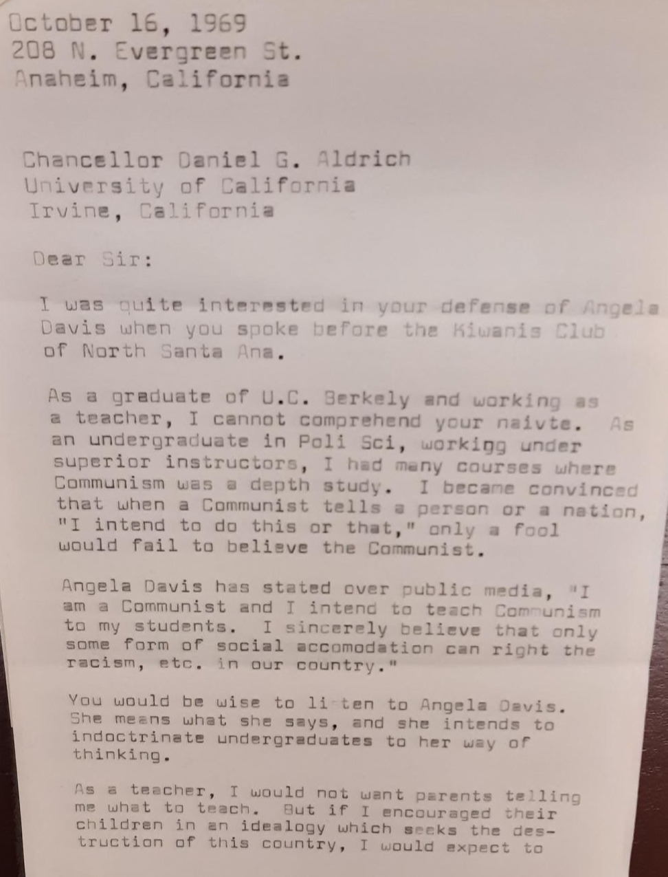편지는 "산타 애나에서 당신이 강연할 때 안젤라 데이비스를 옹호하는 것에 꽤 흥미 있었다"라고 시작했다. 자신을 버클리 대학을 졸업하고 교사로 일하고 있는 사람으로 소개한 그는 '순진해 빠진 당신의 행동을 이해할 수 없다'로 시작해서, '자신이 정치 과학을 전공했을 때 공산주의와 관련한 많은 수업을 들었으며 자신이 생각하기로는 공산주의자들은 그저 우리는 이런저런 것을 할 생각이다라고 사람들에게 얘기할 뿐이어서 바보가 아닌 이상 누구나 믿게 한다'라고 했다.
