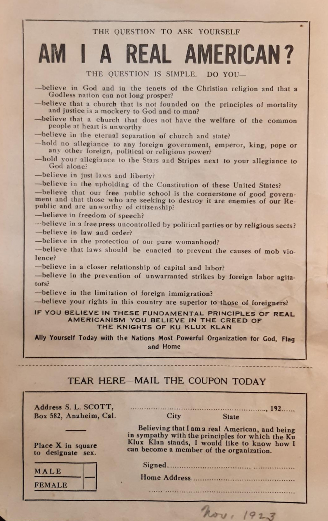 KKK단 애너하임 지부의 가입 홍보문과 가입 원서(1923년)