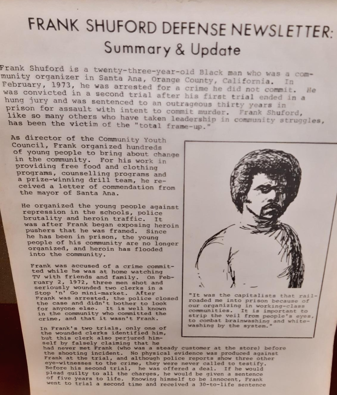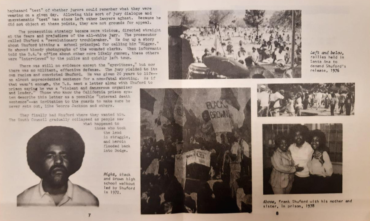 다음으로 본 것은, 1970년대에 산타 애나에서 지역 활동리더로 활동했던 프랭크 셔포드(Frank Shuford)의 석방 운동에 관한 자료들이었다. 수백 명의 젊은이들에게 먹을 것과 옷, 그리고 상담을 제공하는 프로그램을 운영했던 23세의 프랭크 셔포드는 이 공로로 산타 애나 시장에게 칭찬의 편지를 받기도 했다. 하지만 그는 어느 날 살인 미수죄로 붙잡혀 30년형을 선고받았는데, 그는 무죄이고 희생양이며 이 사건은 '전적으로 조작된 사건'이라는 주장이 담긴 자료였다. 자료는 그가 감옥에 간 후 활동가가 없어져서 지역에는 다시 마약 헤로인이 나돌고 있다고 했다.