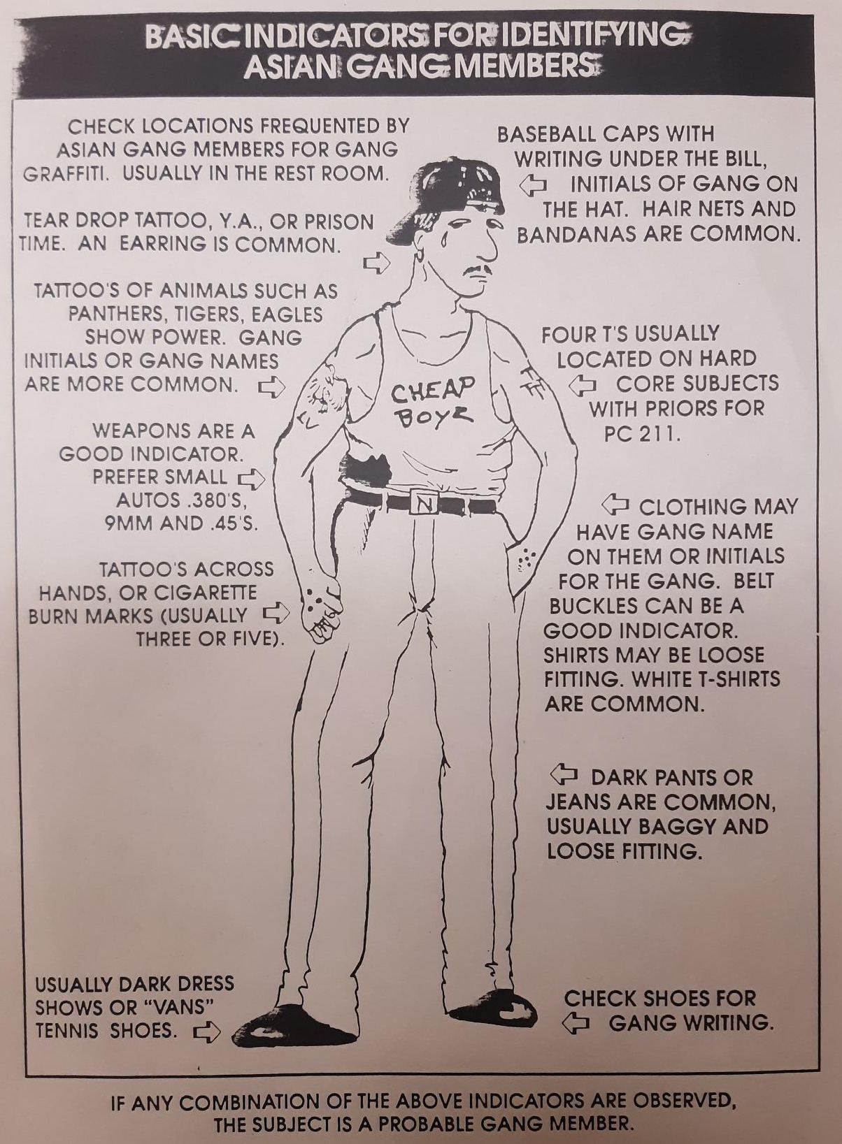 90년대에도 아시안에 대한 혐오의 시선이 강했음을 보여주는 자료들도 있었다. 바로 당시 경찰이 배포한 '아시안 갱' 구별법과 그들을 조심하라는 경고문들이다. 경찰이 제시한 판별법은 지금 보면 어이가 없다. 문신을 했고, 신발은 'Vans'테니스화를, 야구모자를 거꾸로 쓴다는 따위의 기준이다. 물론 총을 가지고 다닌다는 내용도 있다.