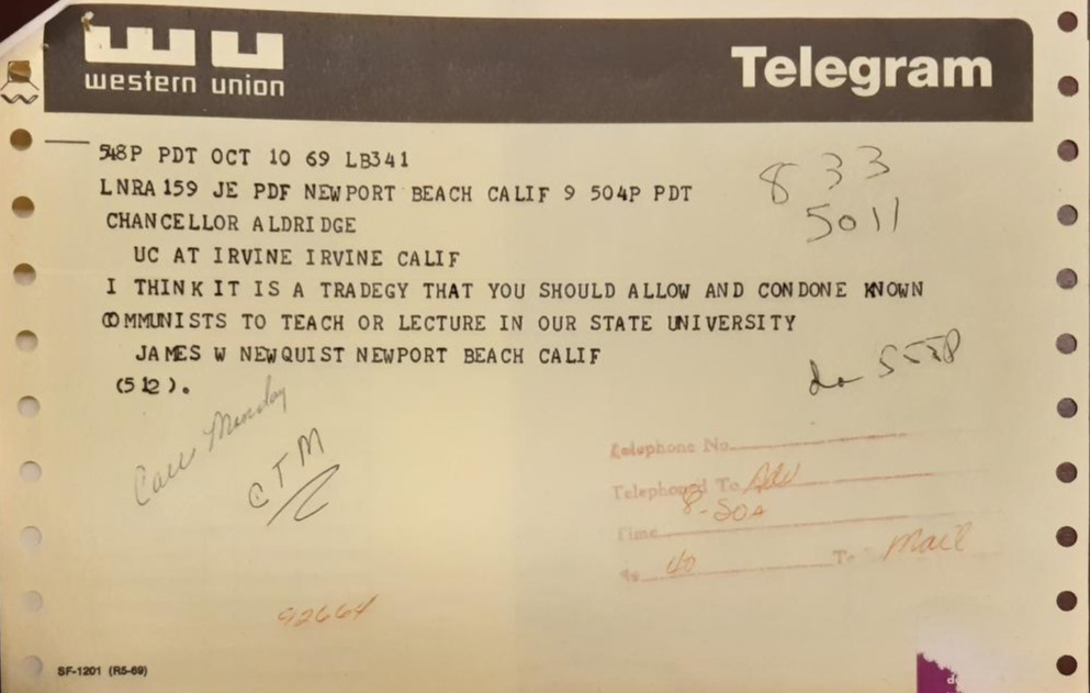 당시 많은 주민과 졸업생들이 당시 Aldrich 총장 앞으로 전보와 편지를 보내어 '공산주의자'가 학교에 와서 강연하는 것을 반대했다. 아래에 보는 것처럼, 이런 전보와 편지가 기록으로 남아 있는 것을 보면 당시 많은 항의가 빗발쳤음을 짐작할 수 있다. 뉴포트 비치에 사는 제임스라는 사람은 총장 앞으로 전보를 보내어 이렇게 얘기했다.
