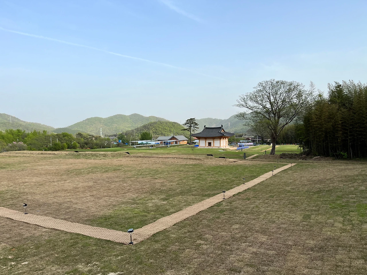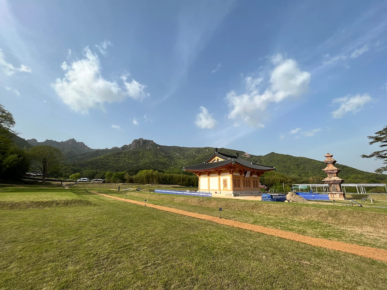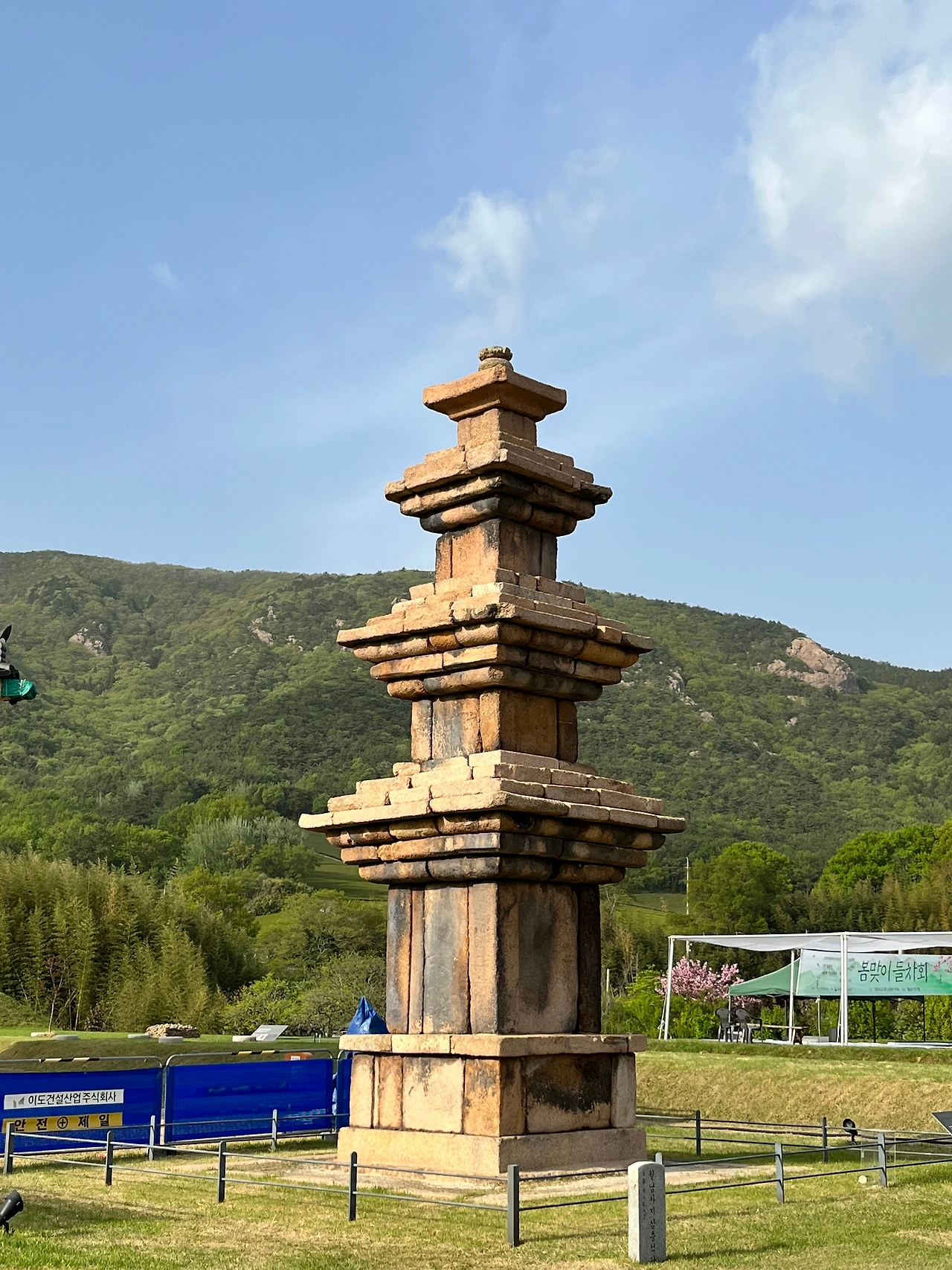 그런데 새로 짓고 있는 이 대웅전이 경관을 가로막고 있는 느낌이 들었다. 이 공사중인 대웅전은 꼭 지어야 했을까. 월남사지는 말 그대로 절터로 남겨두면 안될까. 물론 월남사를 다시 중건하여 옛 영화를 되찾고자 하는 의지는 알겠으나, 옛 모습대로 만들기는 어려울터, 그냥 탑만 있는 절터로 남겨두는 것이 경관면에서나 문화재로서의 가치면에서나 나을 것이다. 아래의 사진에서 새로 짓는 대웅전이 빠진다면 보다 주변경관과 더 잘 어울리는 풍경이 나올 것이다.