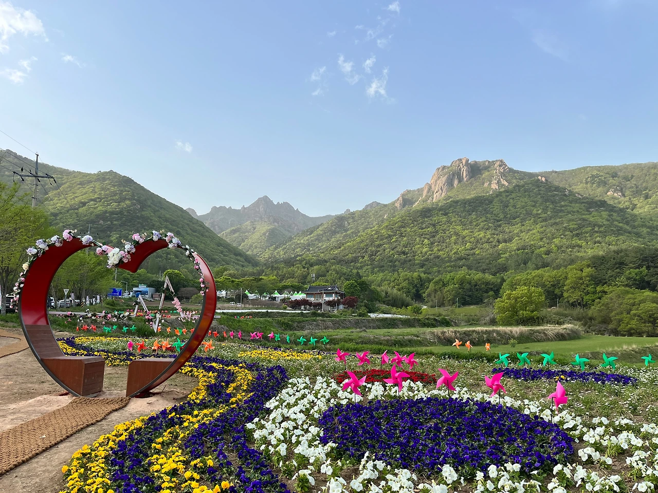 월남사지에서 무위사로 넘어가는 길에는 우연히 찾은 선물(Serendipity라고 하던가)이 있었다. 지도 앱에서 월남사지와 무위사를 검색하다가 발견한 녹차밭 보성다원이다. 월남사지에서 보성다원으로 넘어가는 길목에서는 강진군 성전면의 봄축제가 열리고 있었다. 날이 저물어가서 축제를 즐기지는 못했지만 행사장 입구의 꽃장식을 보며 버스킹은 잠깐 들을 수 있었다.