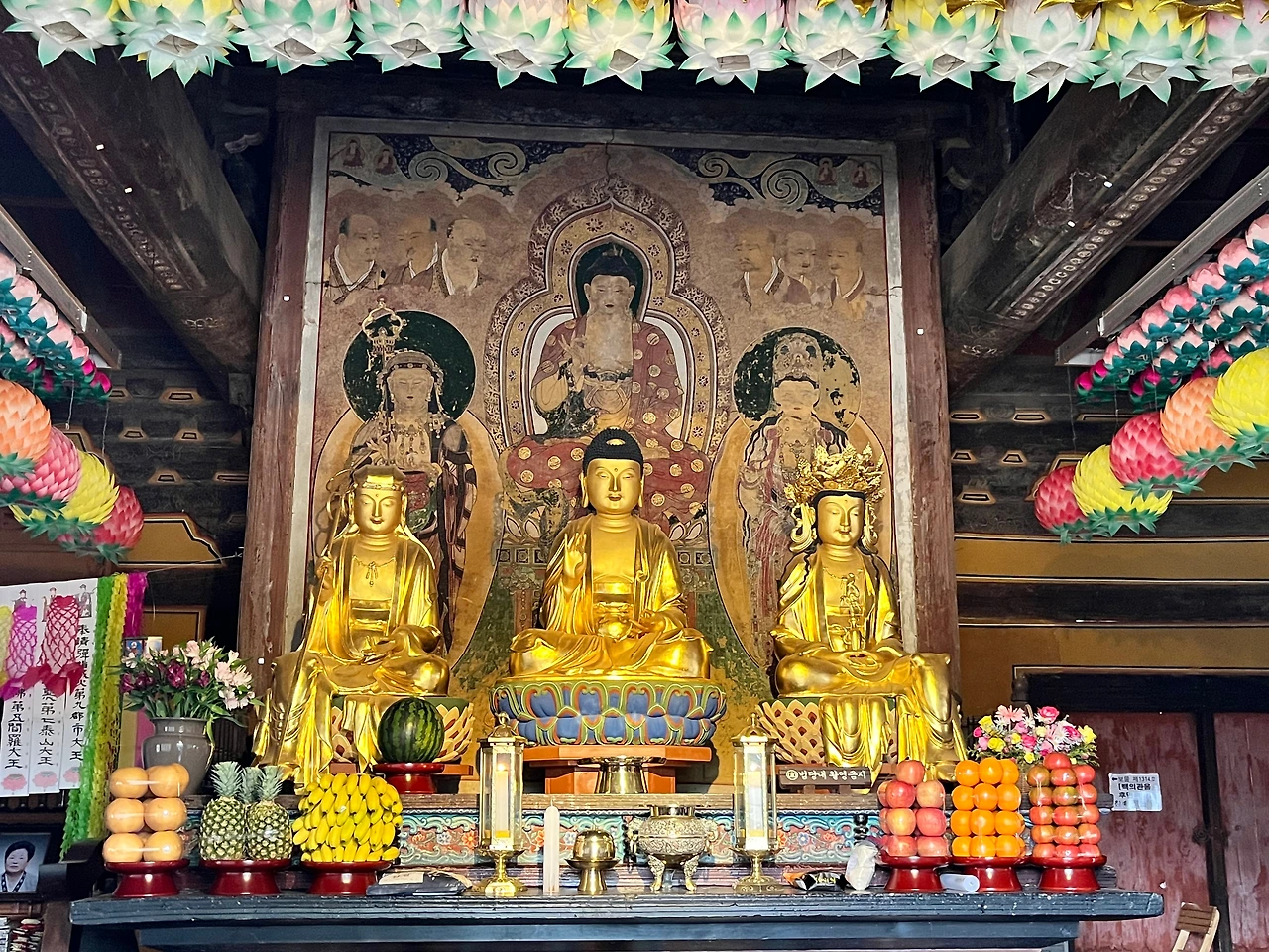 극락보전 안에는 성종 7년에 완성했다는 아미타 삼존벽화와 수월관음도가 있다고 했다. 책에는 답사객들이 법당 안으로 들어갔다고 했는데 나는 들어갈 수가 없어서 문앞에서 들여다 보기만 했다. 아미타 삼존 후불벽화가 눈에 들어왔다. '화려하고 섬세한 고려불화의 전통을 유감없이 이어받은 명작 중의 명작'이라고 극찬한 이 불화는 '조선시대의 불화답게 고려불화의 2단 구도를 포기하고 화면을 꽉 채우는 원형구도로 바뀌었다.'고 한다. 책에서는 부처님의 양 옆으로 협시보살이 서고 그 위쪽으로 6인의 나한상이 구름속에 있으면서 '행복한 친화관계'를 이루고 있다고 표현하고 있다. 금빛으로 잘 칠해진 불상의 뒤에 보이는 후불벽화는 색채가 빛이 바래기도 했지만 요란하지 않고 품위가 있는 느낌이었다. 안으로 들어갈 수가 없어 다른 불화들은 보지 못하여서 아쉬웠다.