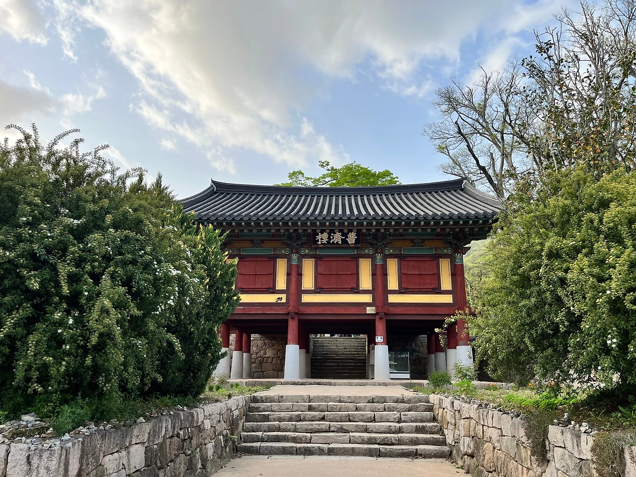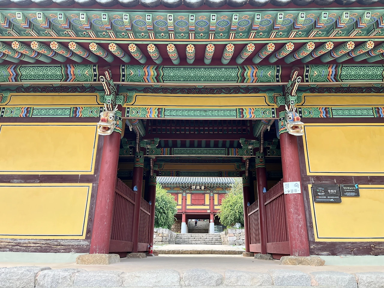 무위사 입구인 일주문에서 바라보면 천왕문과 보제루가 일직선으로 이어져 있다. 절의 경내로 들어오려면 이렇게 세번 정도 속세의 때에 찌든 마음을 정화해야 하는 것이 아닐까 싶다.