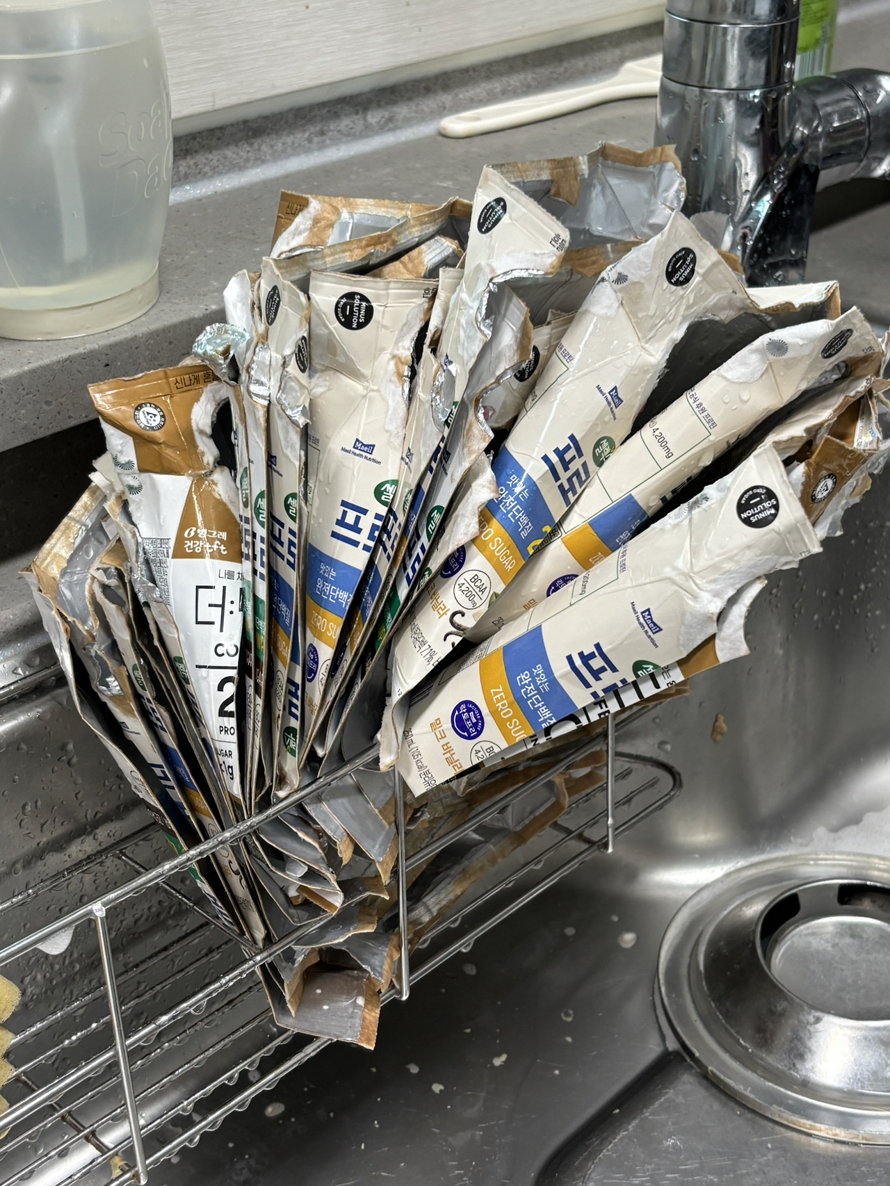 비효율적이다. 친환경은 효율적일 수 없을까. 30분정도가 걸렸고 다음에 또 하고 싶지않다는 생각이 쑥 들었다. 이것을 씻어내는 동안 들어가누 물도 자원이다. 주동이를 분리할 때 힘을 많이 써서 팔뚝 근육이 꽤나 에리다. 뚜껑을 닫아 보관했 던 팩은 냄새가 났고, 열어 보관했던 것은 음료가 굳어 씻기가 버거웠다. 습관처럼 설거지를 할 때마다 챙기거나, 시간을 잡아 분리해야한다. 한번 더 시도할 일이 있을 수도 있겠지만, 아마 종량제봉투에 넣어보내게 되지 않을까 싶다.