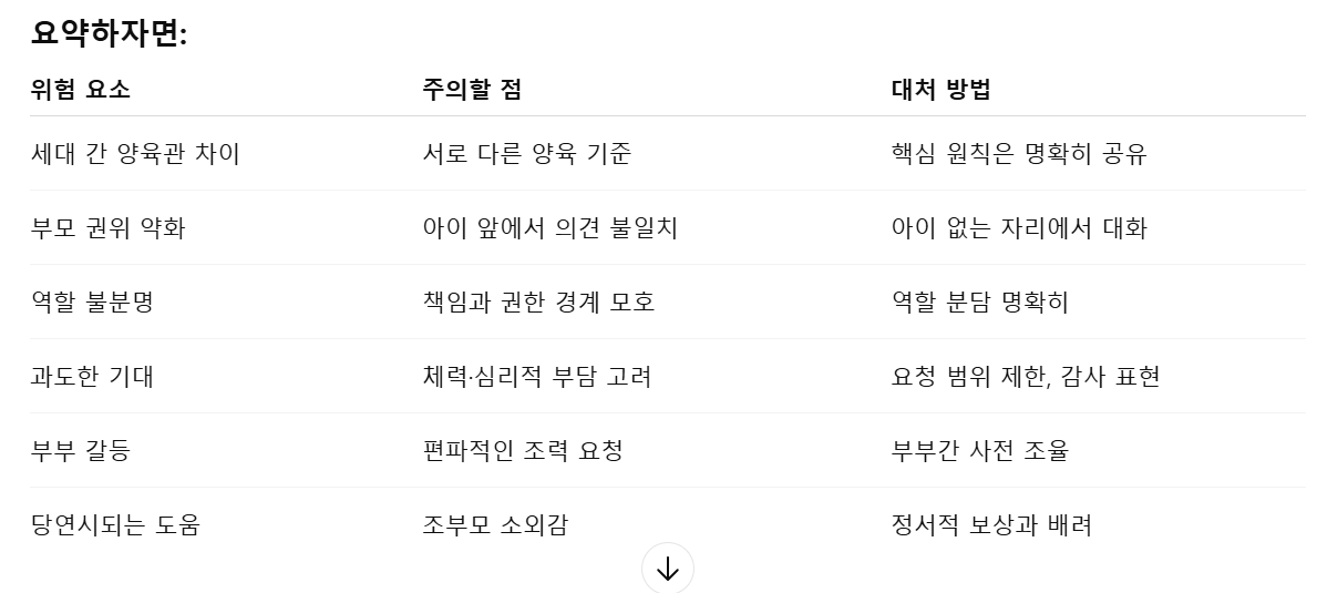 그리고 무엇보다. 조부모에게 양육을 맞기가 전에 부부의 의견이 먼저 합의되어야 하는데, 이게 무엇이 있을지 더 고민해 보아야겠다는 생각이 들었다. 챗 지피티는 부부양육협약서를 써야 한다고 하는데, 남편은 이런 것을 법리적인 관계라는 것에 거부감이 들어 매우 싫어한다. 하지만 한번쯤 나눠 볼 만한 이슈인 것 같다.