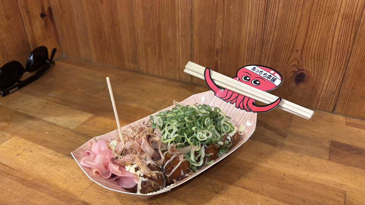 역시 바로 해주는 곳에 와서 그런가 더운날씨임에도 김이 모락모락나는 것이 입맛을 돋구어준다. 그리고 이 그릇디자인이 감각적이다 나무배에 문어가 젓가락을 들어주는 모양새라니 저녁에도 다른 집에서 타코야끼를 먹었지만 역시 방금해준 타꼬를 일본인이 직접해줄 때 뭔가 더 원조스러운 느낌이 든다.